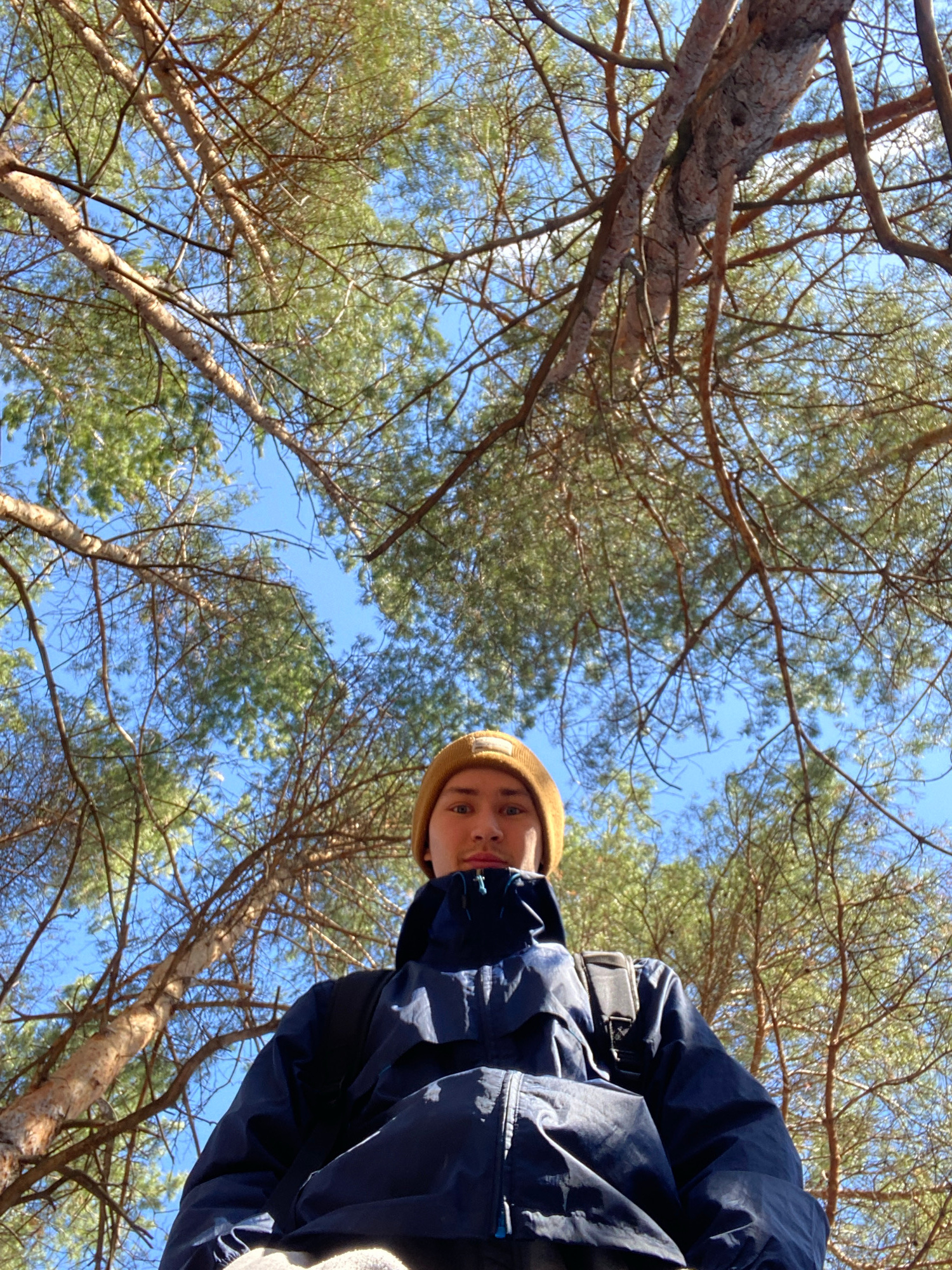 This image presents a unique low-angle perspective, looking upwards through a forest canopy. The main subject is a young person, partially visible in the upper right of the frame, appearing to look do…read more