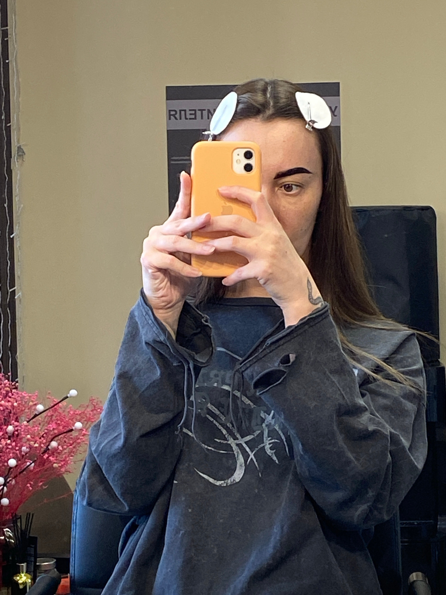 A woman with brown hair and pale skin is taking a selfie in a seated position. She has two white hair clips in her hair near her forehead. Her dark-colored shirt has a distressed design and holes in t…read more