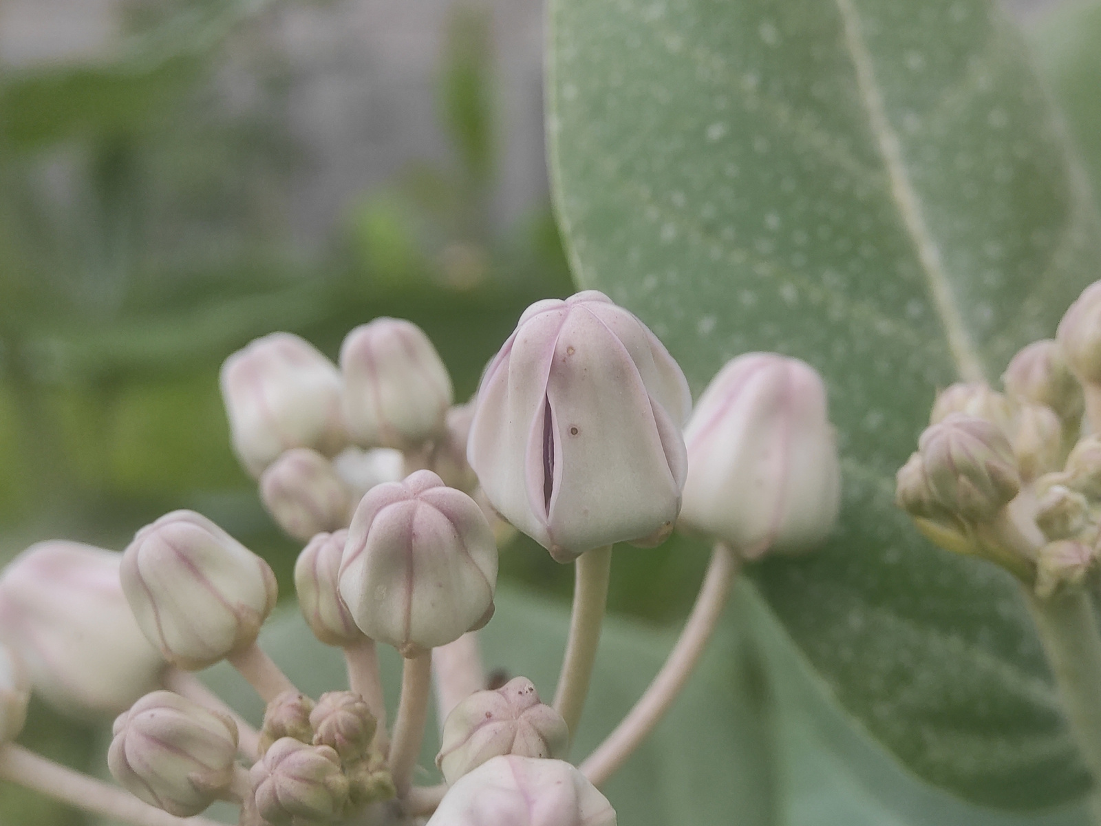 The image shows a close-up of several unopened white and light purple flower buds. One of the buds has a small slit revealing a darker interior. The background includes a large, out-of-focus green lea…read more