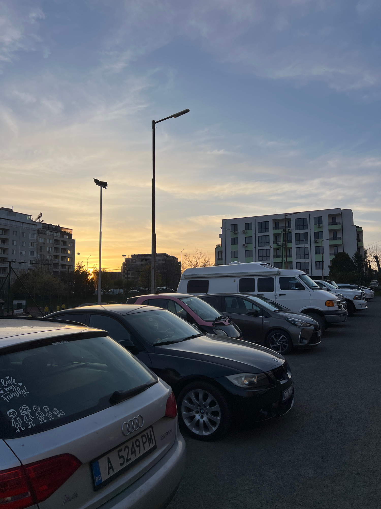 Here is a description of the image: The image shows a row of parked cars on an asphalt surface. The sky is visible in the background, with sunset colors. Buildings can be seen in the distance, indica…read more
