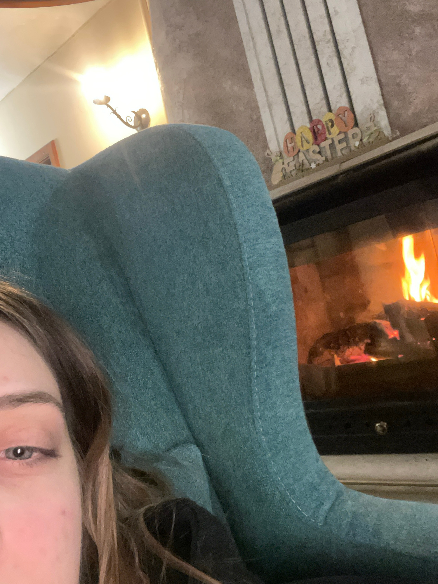 A close-up, tilted indoor shot focuses on a person's face, specifically their eye and forehead, with brown and blonde hair. The person is positioned in front of a teal-colored upholstered object, poss…read more