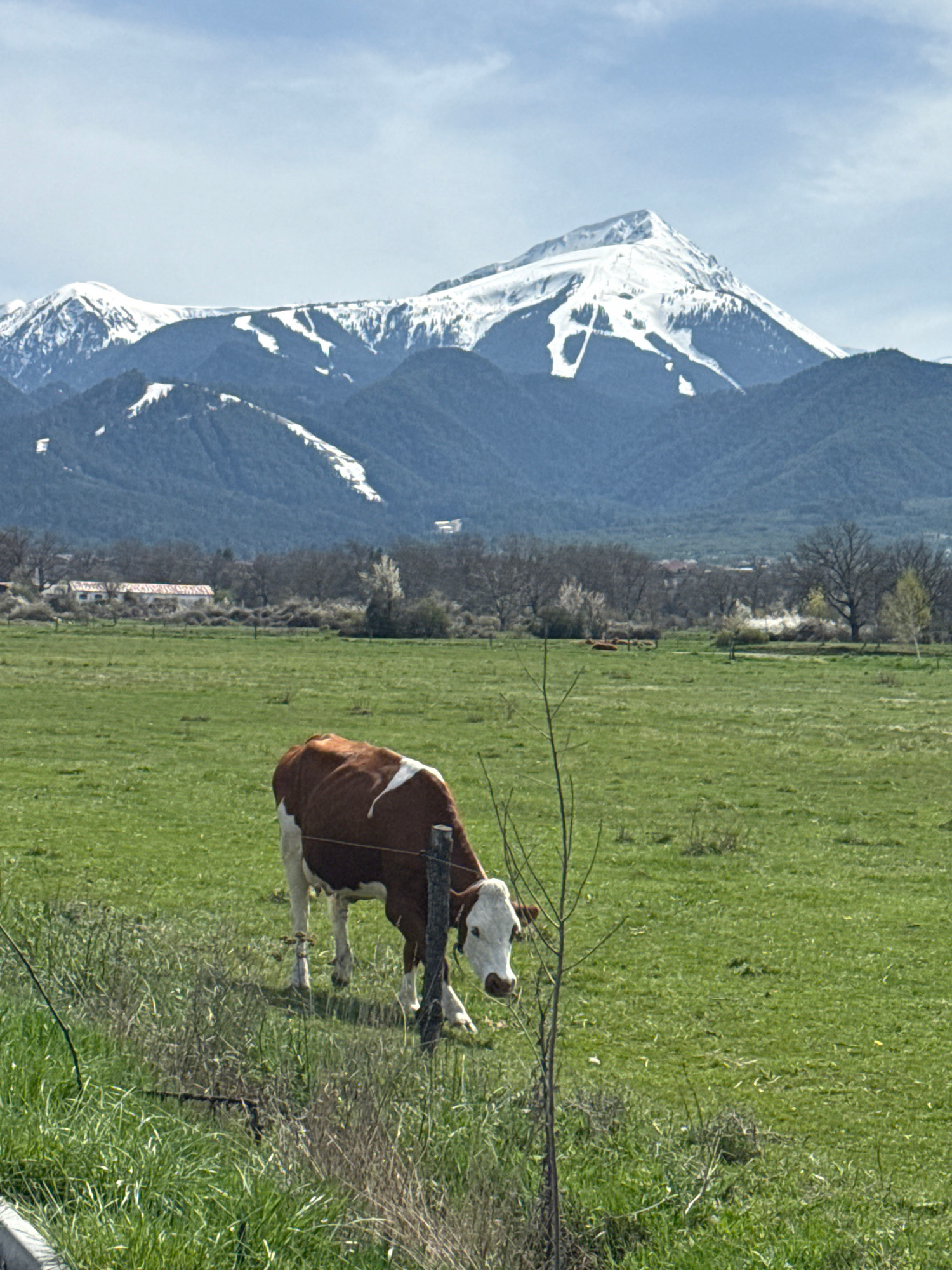 This image captures a serene rural landscape set against a majestic mountain backdrop. The main subject is a brown and white cow, standing in a vibrant green pasture. The cow, with distinct white mark…read more