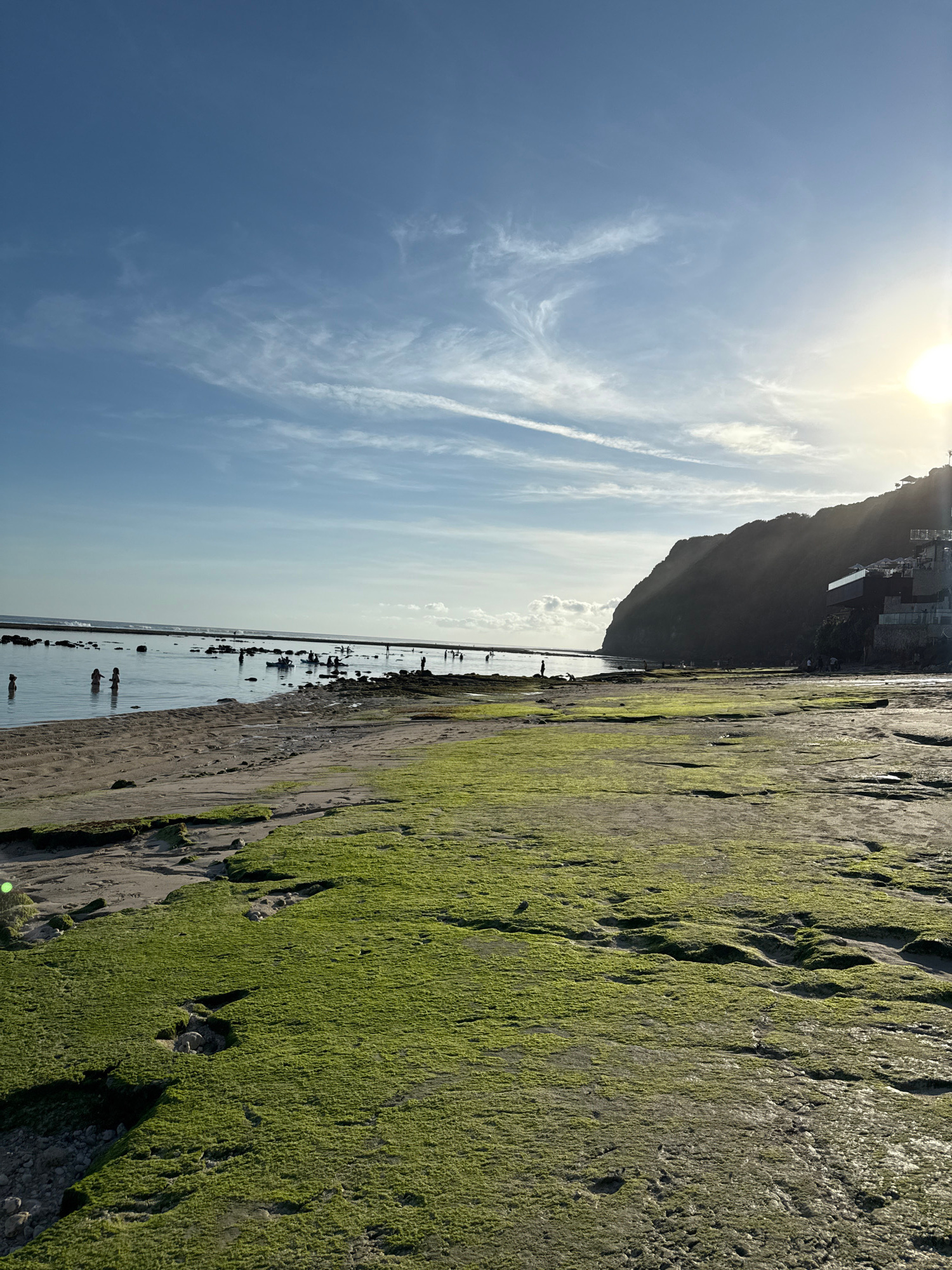 The image shows a coastal scene in Kuta Selatan, Indonesia. The photograph is oriented vertically. The sky is a light blue with wispy white clouds in the upper left. The sun is at the top center, crea…read more