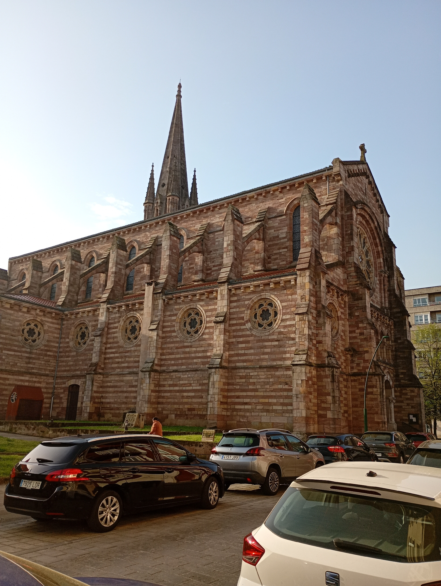 The image depicts the Iglesia de la Asunción, a church located in Torrelavega, Spain. The church, constructed primarily of red brick, dominates the frame with its Gothic architecture. Notable features…read more