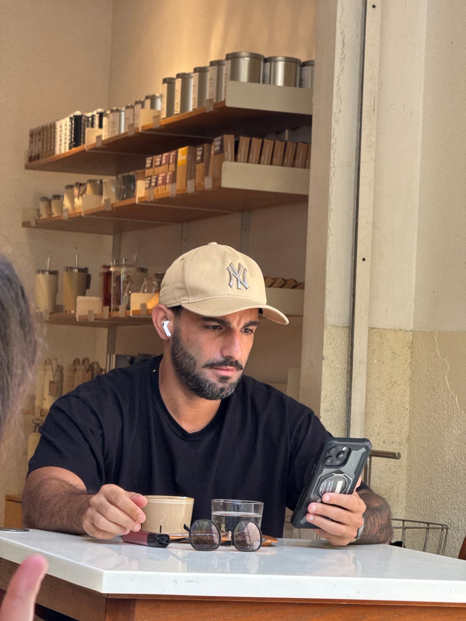 A man with a beard wearing a beige New York Yankees baseball cap, a black t-shirt, and an earpiece is seated at a table. He is holding a cup in his left hand and a smartphone in a black case in his ri…read more
