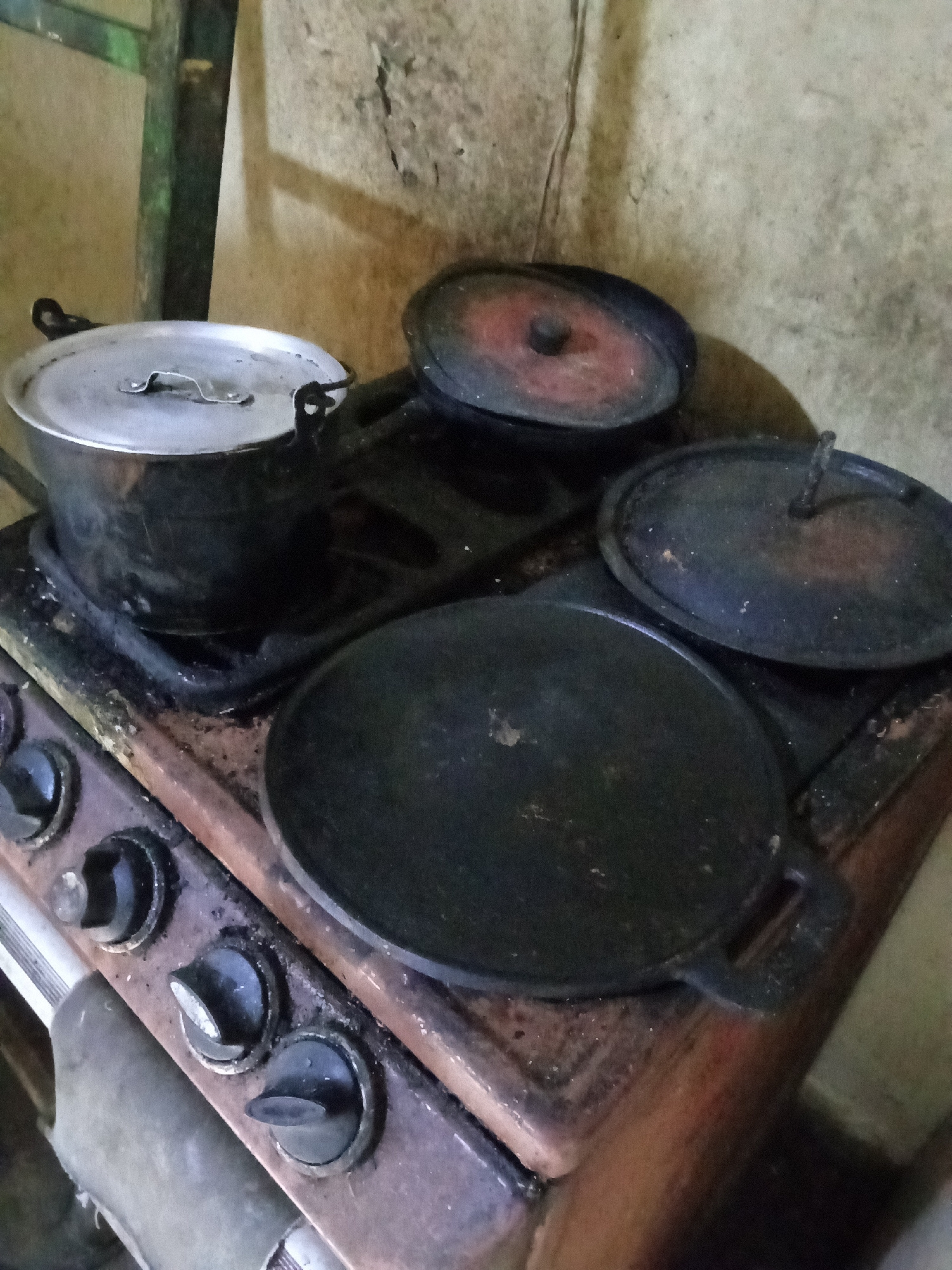 The image shows a worn and dirty stove in Tinaquillo, Venezuela. A lidded pot sits on one burner, and three lids are placed on the others. The stove itself is old and appears to be in poor condition.…read more