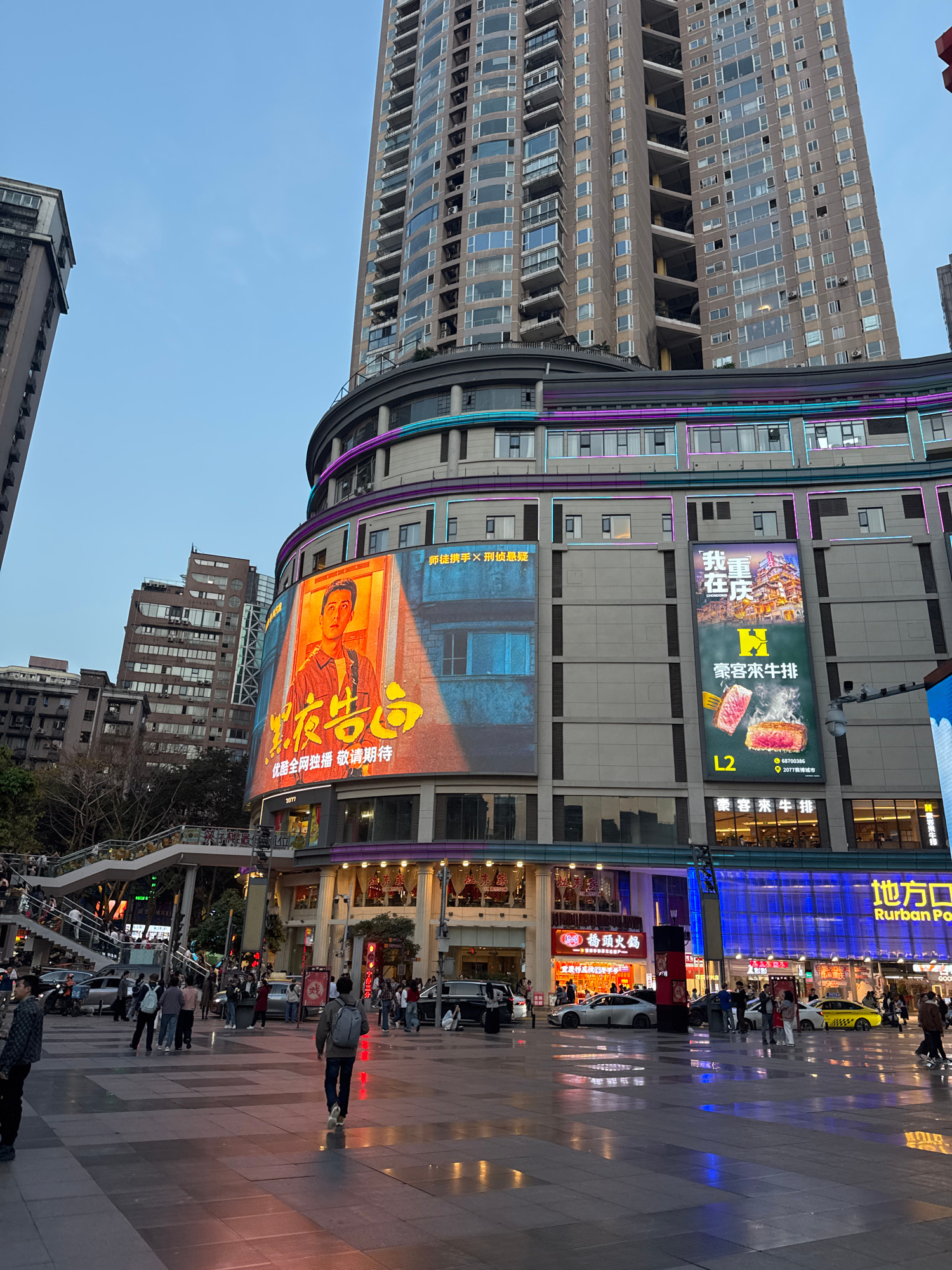The photograph captures a busy urban scene in what appears to be the Yuzhong District of Chongqing, China. The sky is a clear blue. A tall, modern building with a curved facade is prominently featured…read more