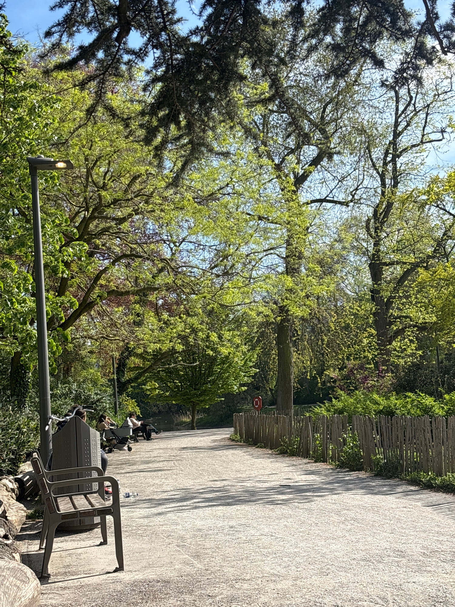 The image depicts a sunny outdoor scene, likely in a park or garden in Antwerp, Belgium. The ground is covered with a light-colored gravel or paved path, alongside a rustic wooden fence overgrown with…read more