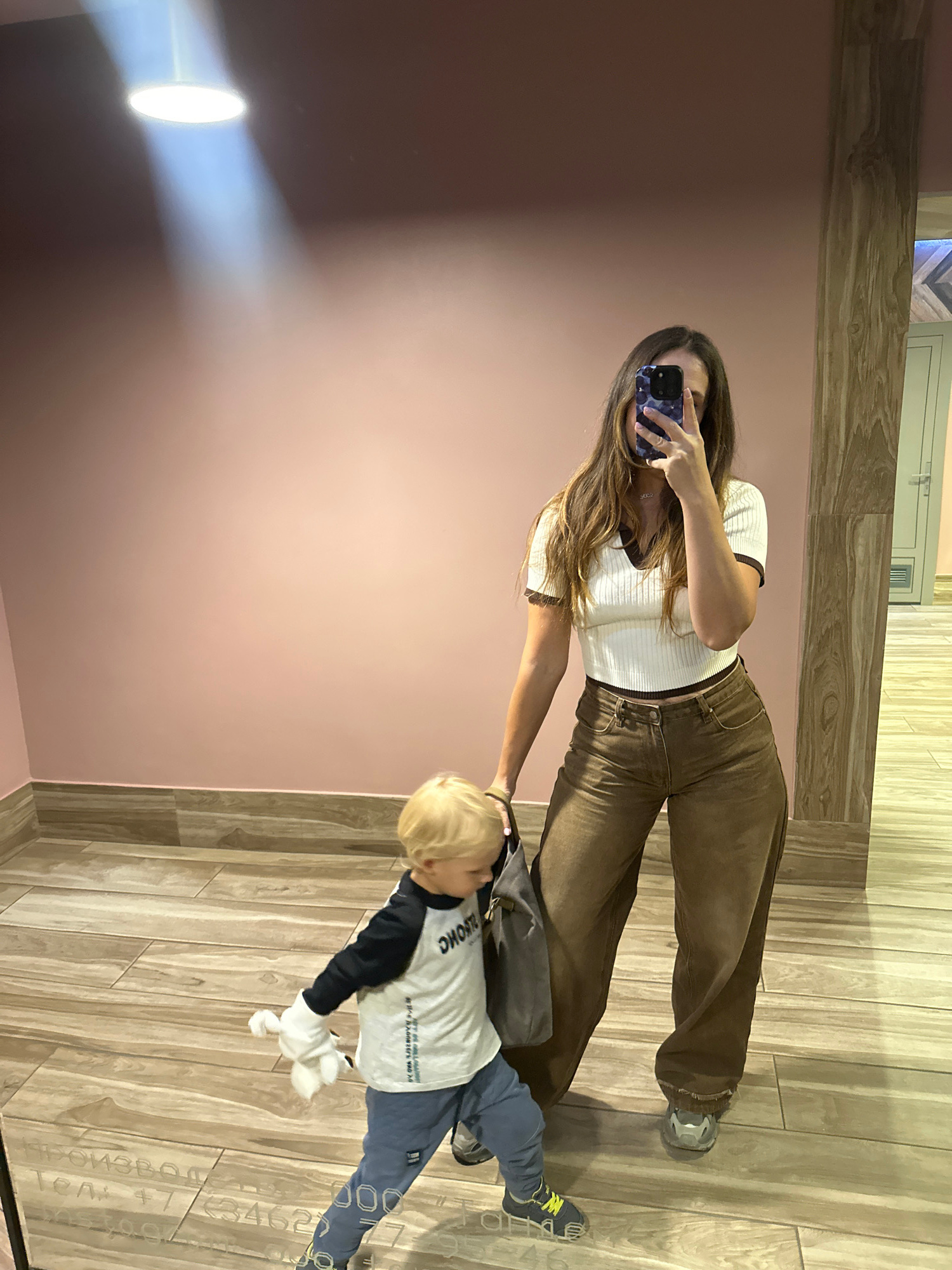 A woman in a white and brown top and brown pants takes a mirror selfie with a phone in a blue case, while holding the hand of a young child with blonde hair. The child wears a light grey shirt with bl…read more