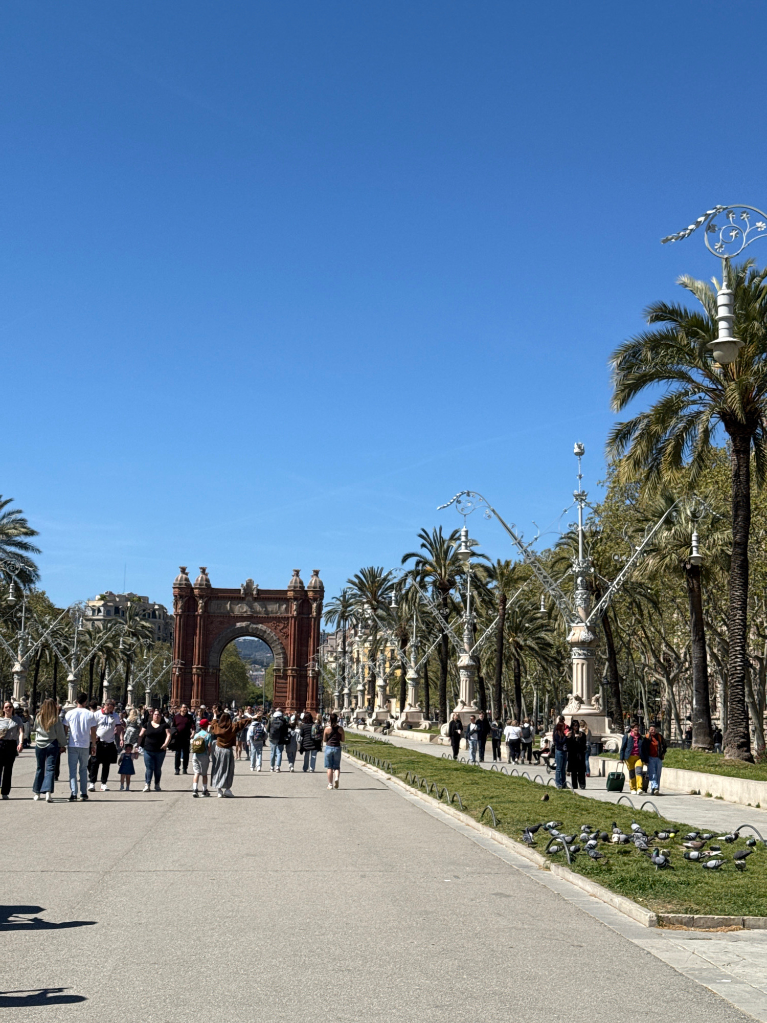 The image shows the Arc de Triomf in Barcelona, Spain, seen from a ground-level perspective on a clear day. The arch, made of red brick, is centered in the lower part of the frame. A group of people iā¦read more