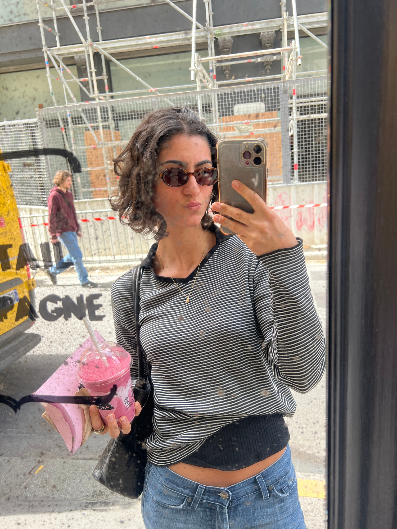 This is a mirror selfie showing a woman outdoors in an urban setting. The image is taken through a reflective surface, likely a shop window or large mirror, and is oriented vertically in the provided…read more