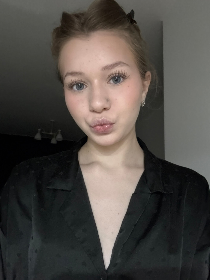 The image depicts a young Caucasian female in a posed self-portrait, captured indoors in Yekaterinburg, Russia. Her head and upper torso are visible. Light-colored hair, possibly blonde, is styled wit…read more