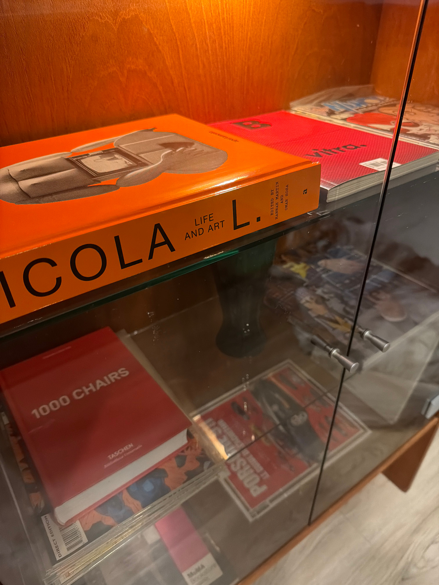 Here is a concise description of the image: The image shows a close-up of books stacked under a glass-topped surface, possibly a coffee table. Prominently featured is an orange book titled "NICOLA L.…read more