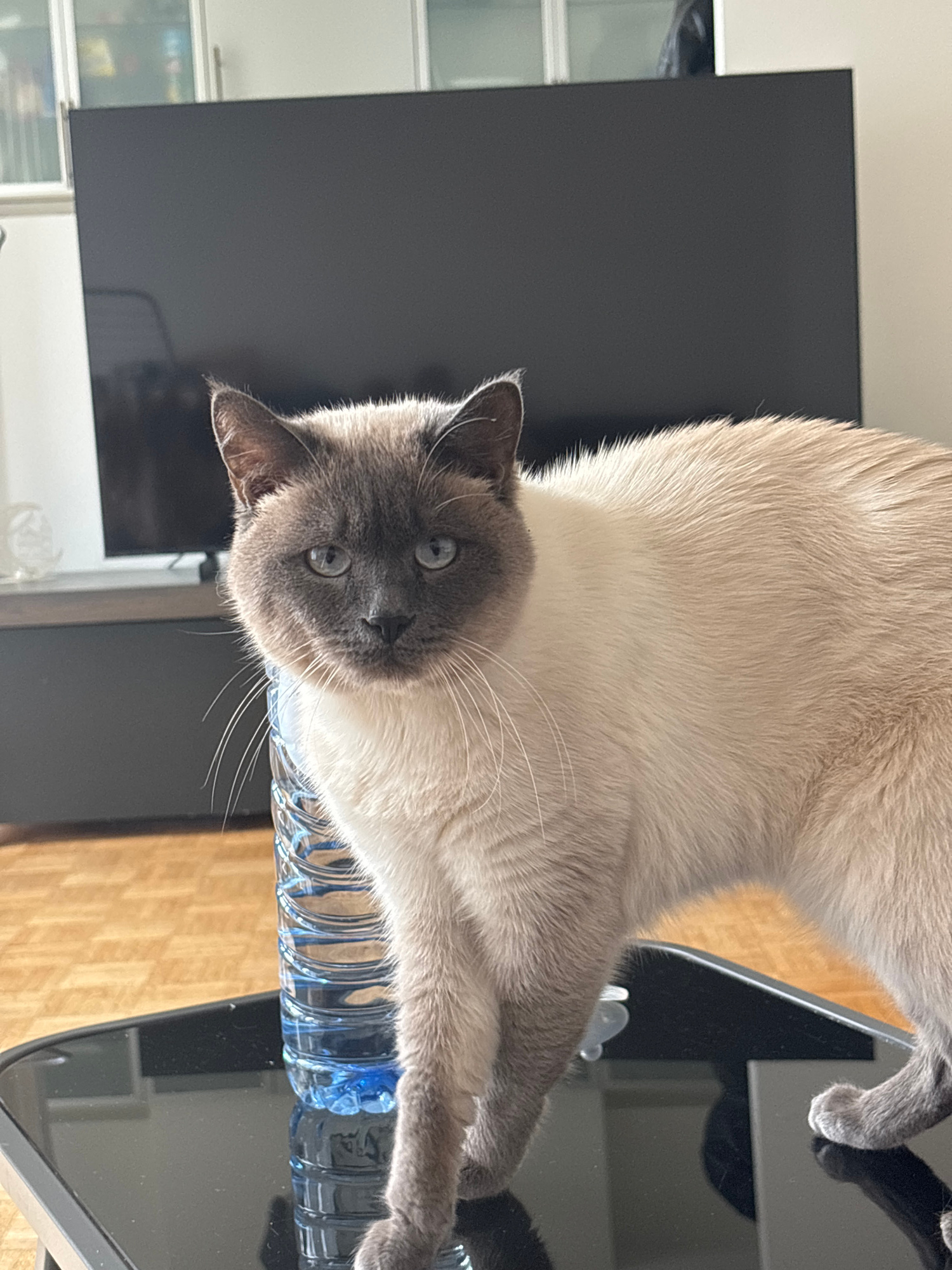 A medium shot depicts a Siamese cat, its face a mask of dark gray fur, resting on a clear, ridged plastic water bottle. The cat's body, primarily tan, extends across a glossy black surface, likely a t…read more