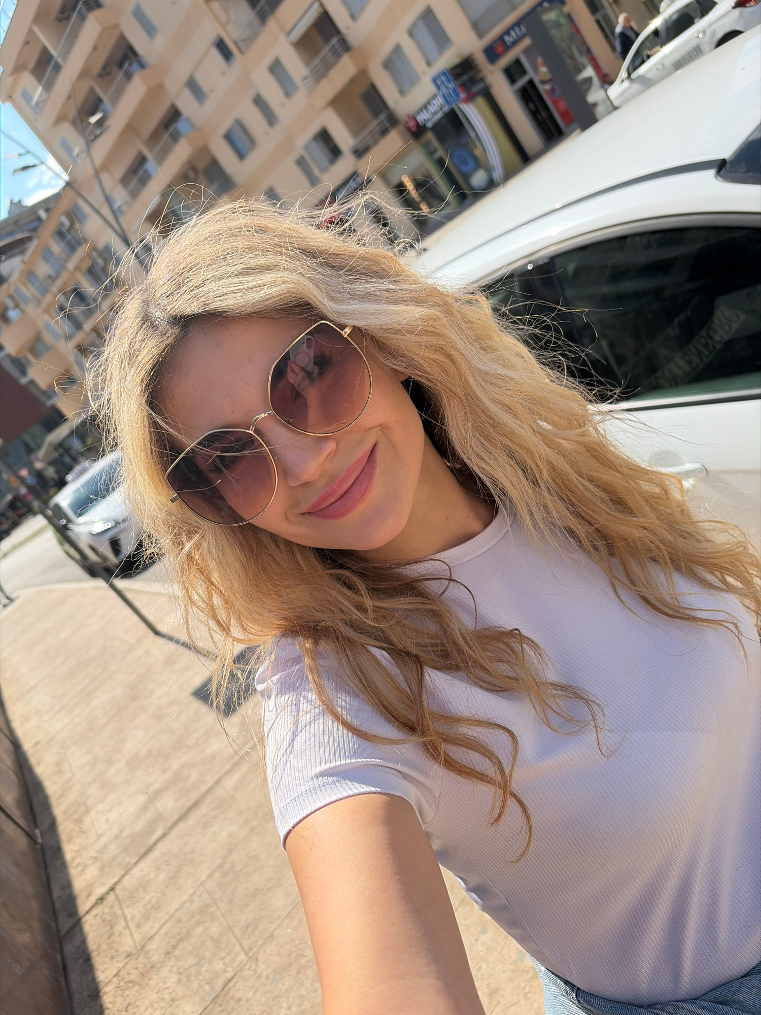 A woman with long, blonde wavy hair poses for a selfie outdoors on a sunny day. She wears sunglasses with round frames and a white, short-sleeved shirt. She is near a white vehicle with reflective win…read more