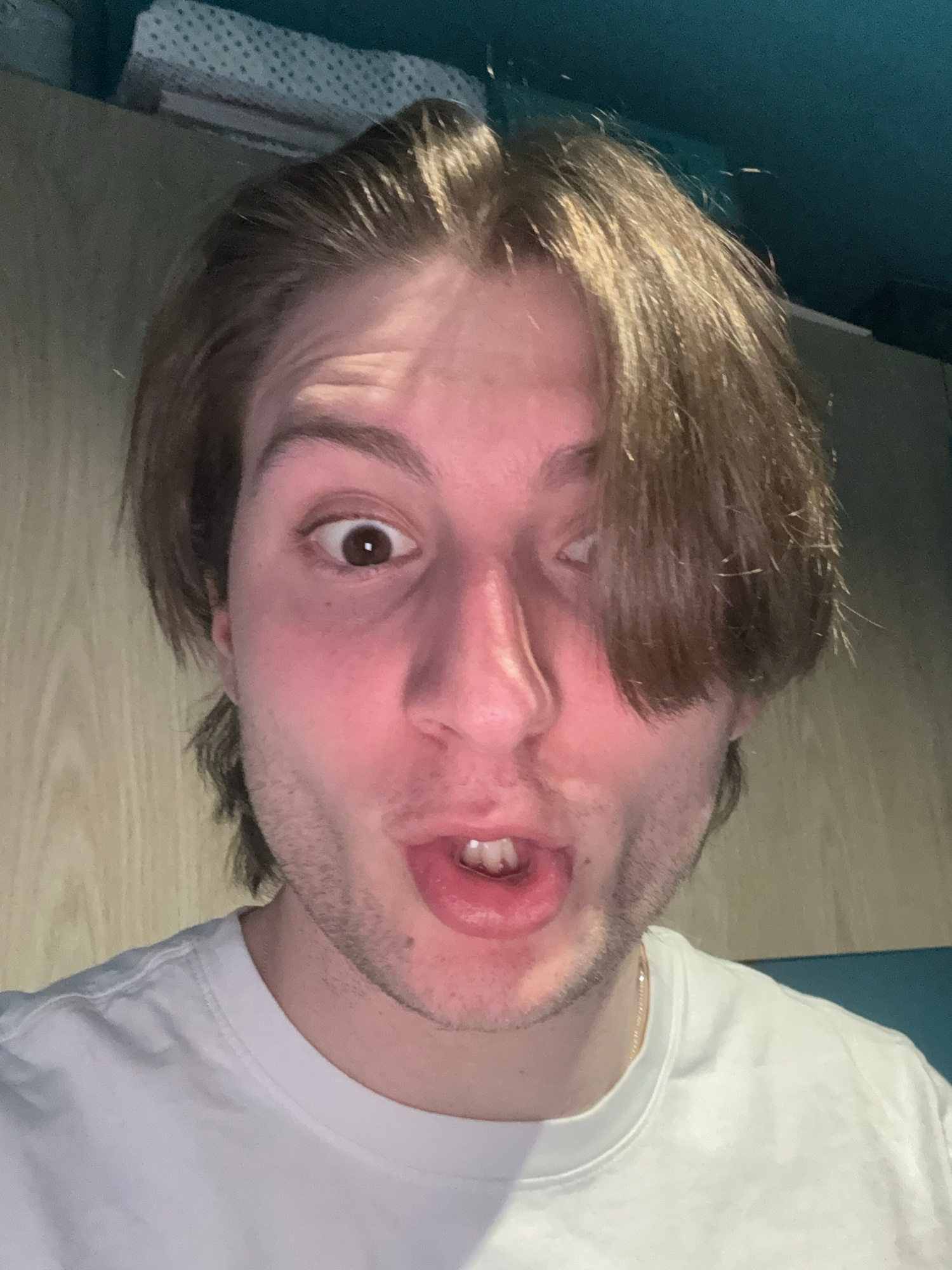 A close-up, tilted self-portrait shows a young man with light brown hair and a white t-shirt. His face is distorted, with his nose wrinkled and mouth open, revealing his teeth. He is looking at the ca…read more