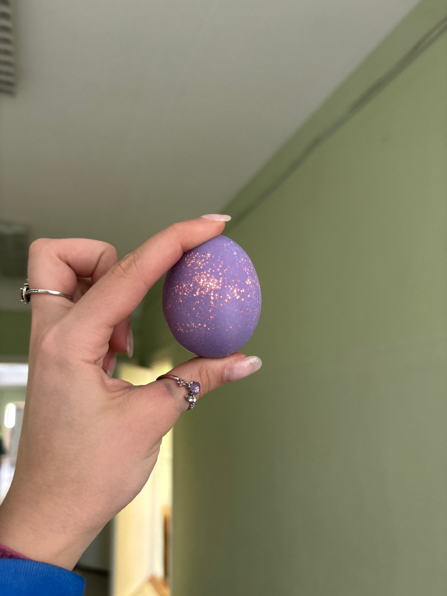 A hand holds a purple, glittered egg. The hand has two rings, one on the thumb and one on the index finger. The background is a light green wall. The location is indeterminable from the provided image…read more