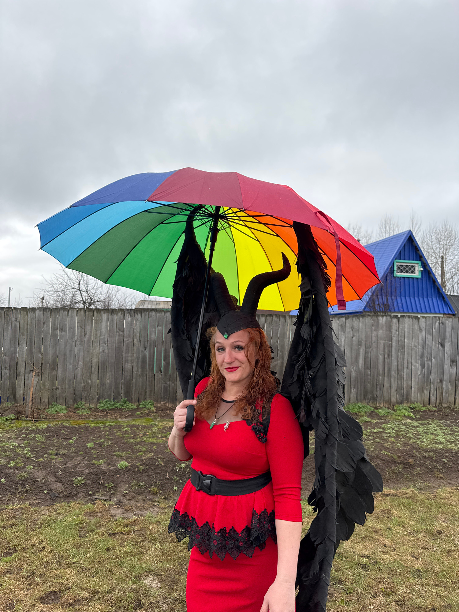 A woman stands outdoors holding a rainbow-colored umbrella. She is wearing a red dress with black lace trim, black wings, and horned headwear, suggesting a costume or cosplay. The backdrop includes a…read more