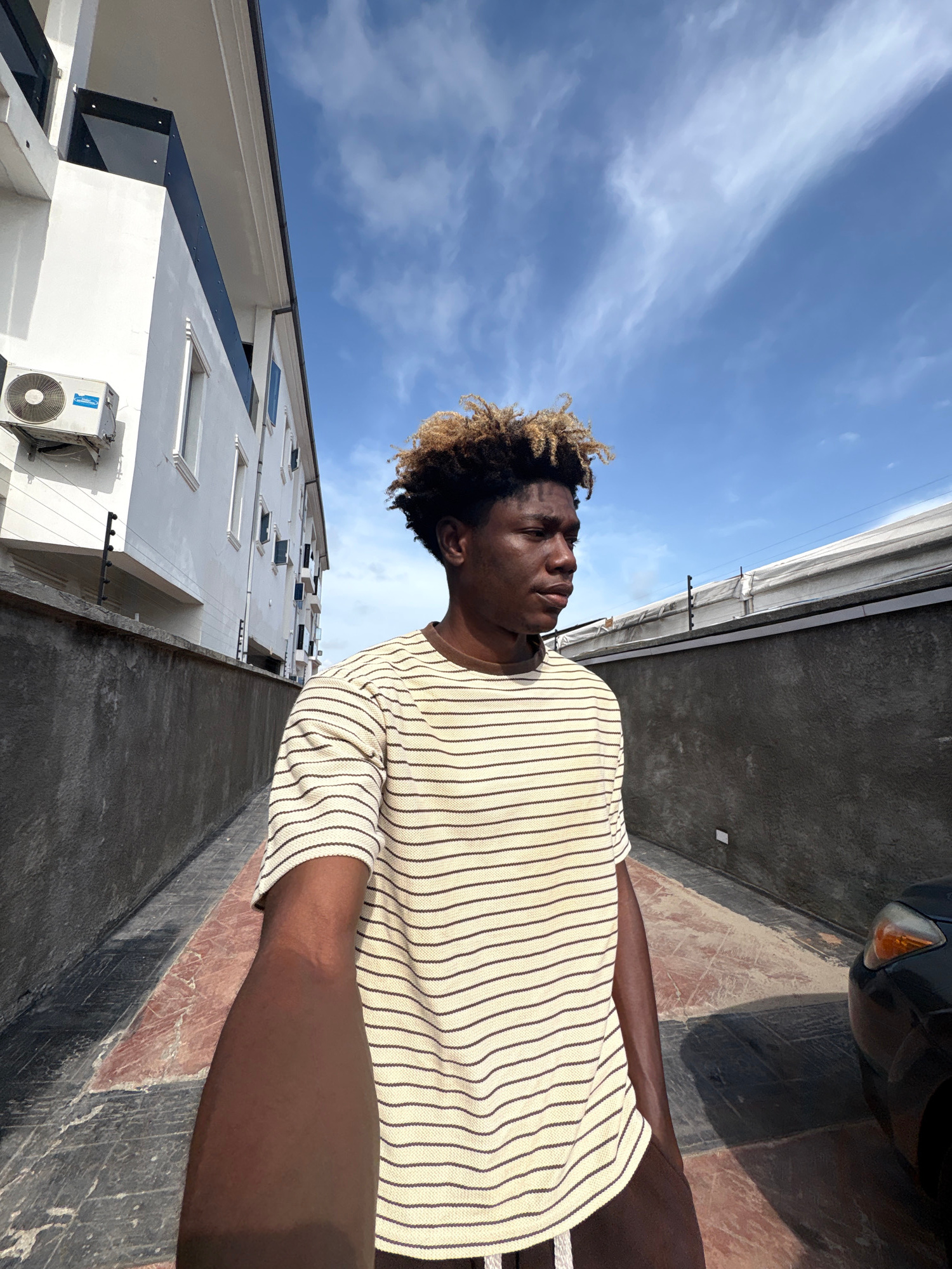 A low-angle shot depicts a man in a vertically-striped shirt standing outdoors in Igboefon, Nigeria. He has dark skin and short, curly hair that is blonde at the tips. He is looking towards the left o…read more