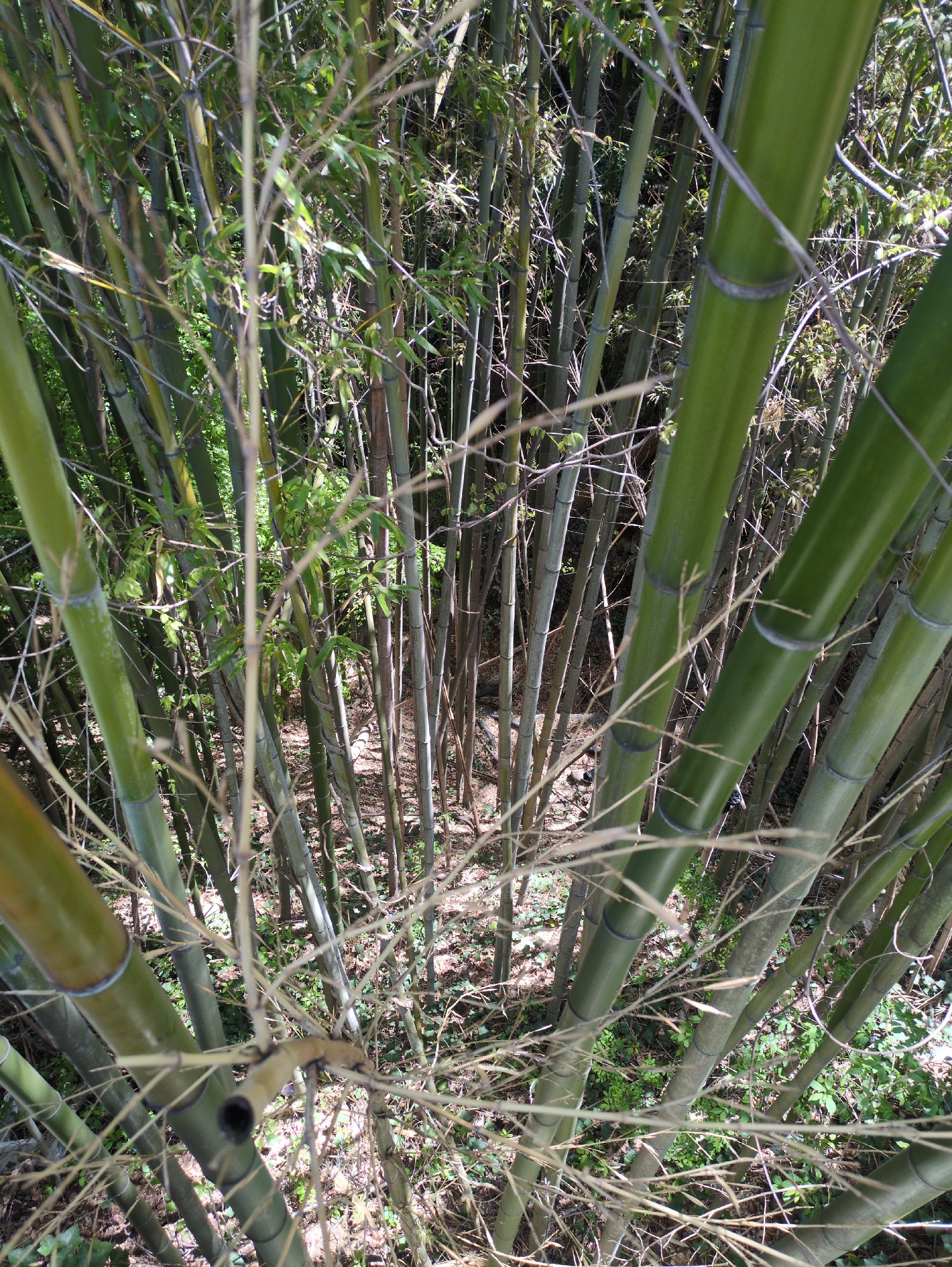 The image shows a dense bamboo forest, viewed from an elevated perspective, looking down. The bamboo stalks are predominantly green, with some showing a slight yellowing. There are also dried bamboo l…read more