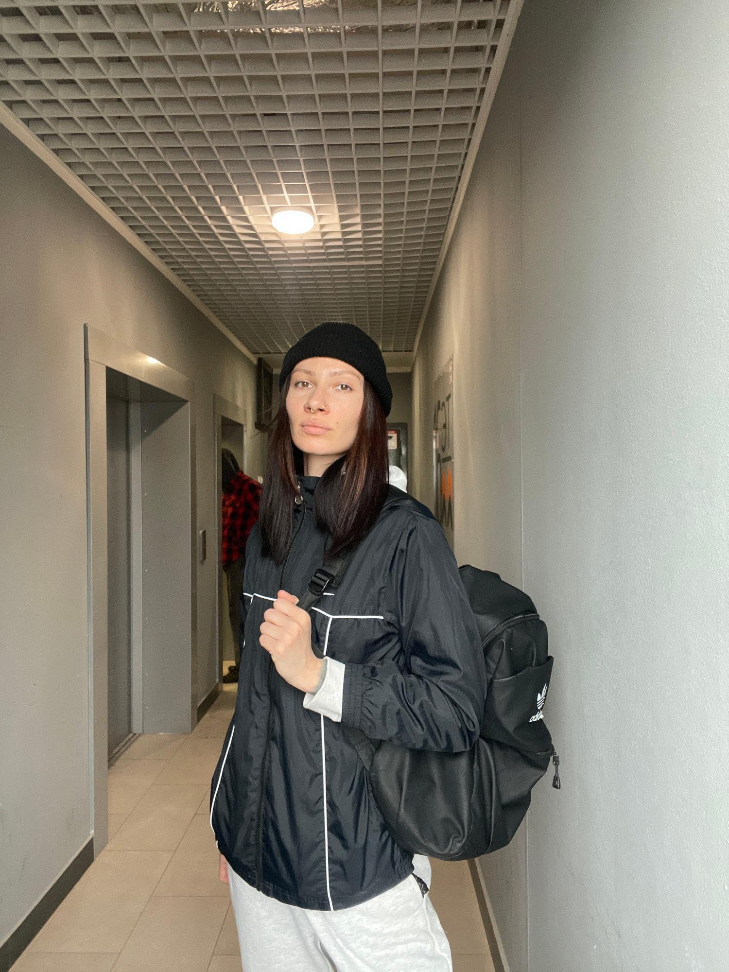 A woman wearing a black beanie, black jacket with white trim, and a black backpack stands in a narrow hallway. The hallway has a wall with a grid-like pattern on one side, a light fixture illuminating…read more