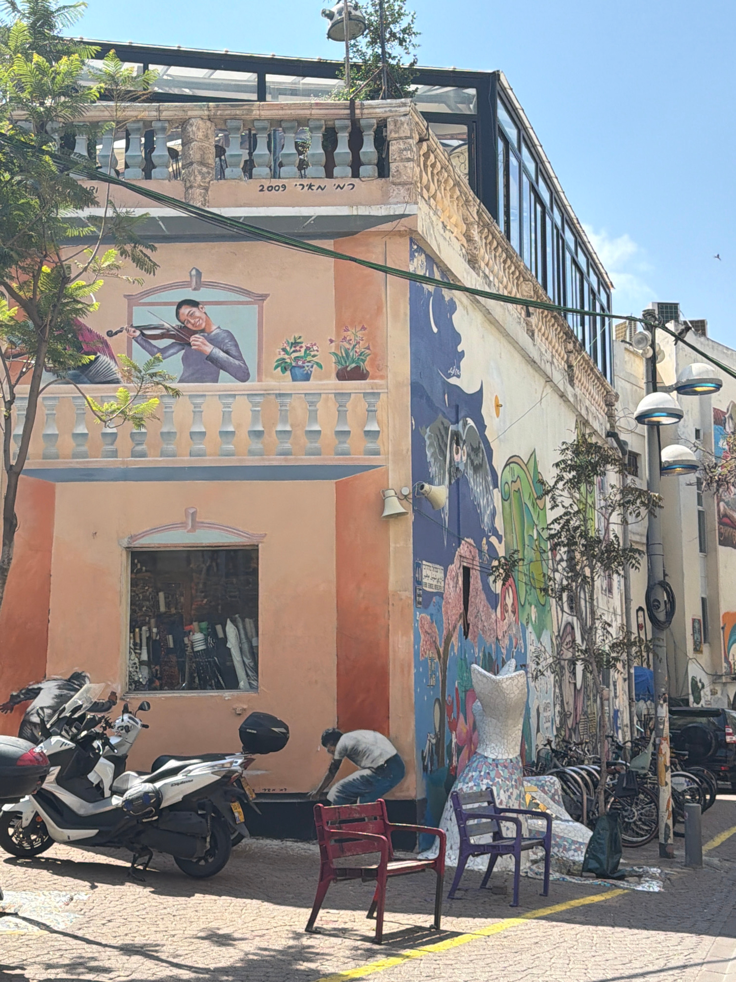 The image depicts a building facade in Tel Aviv, Israel, notable for its large mural. The mural features an orange and peach-colored section at the bottom, depicting a man playing a violin within a fa…read more