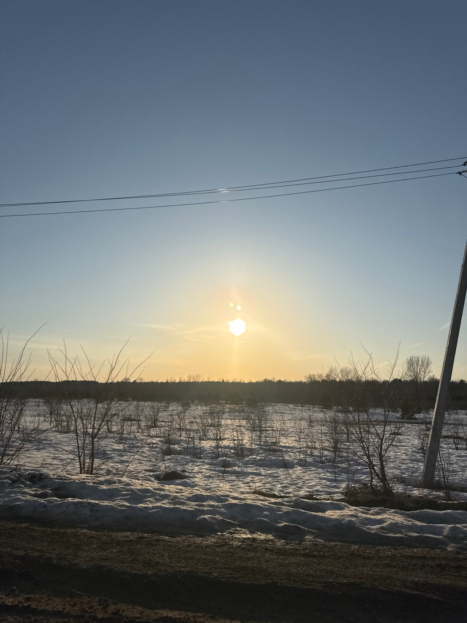 The image depicts a landscape in Noviy, Russia, during what appears to be a winter or early spring scene. The sun is low on the horizon, creating a bright glare and casting shadows across the snowy gr…read more