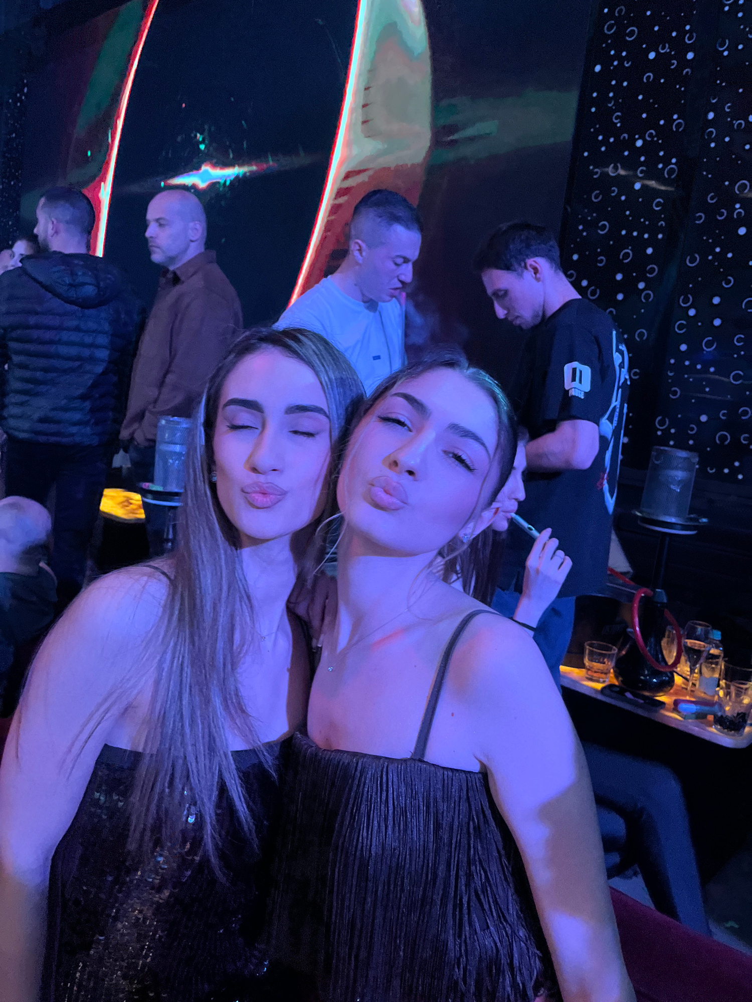 Two young women are posing closely together for a selfie. Both have their lips pursed as if giving a kiss. Behind them, several people are standing or sitting, including three men with shaved heads an…read more