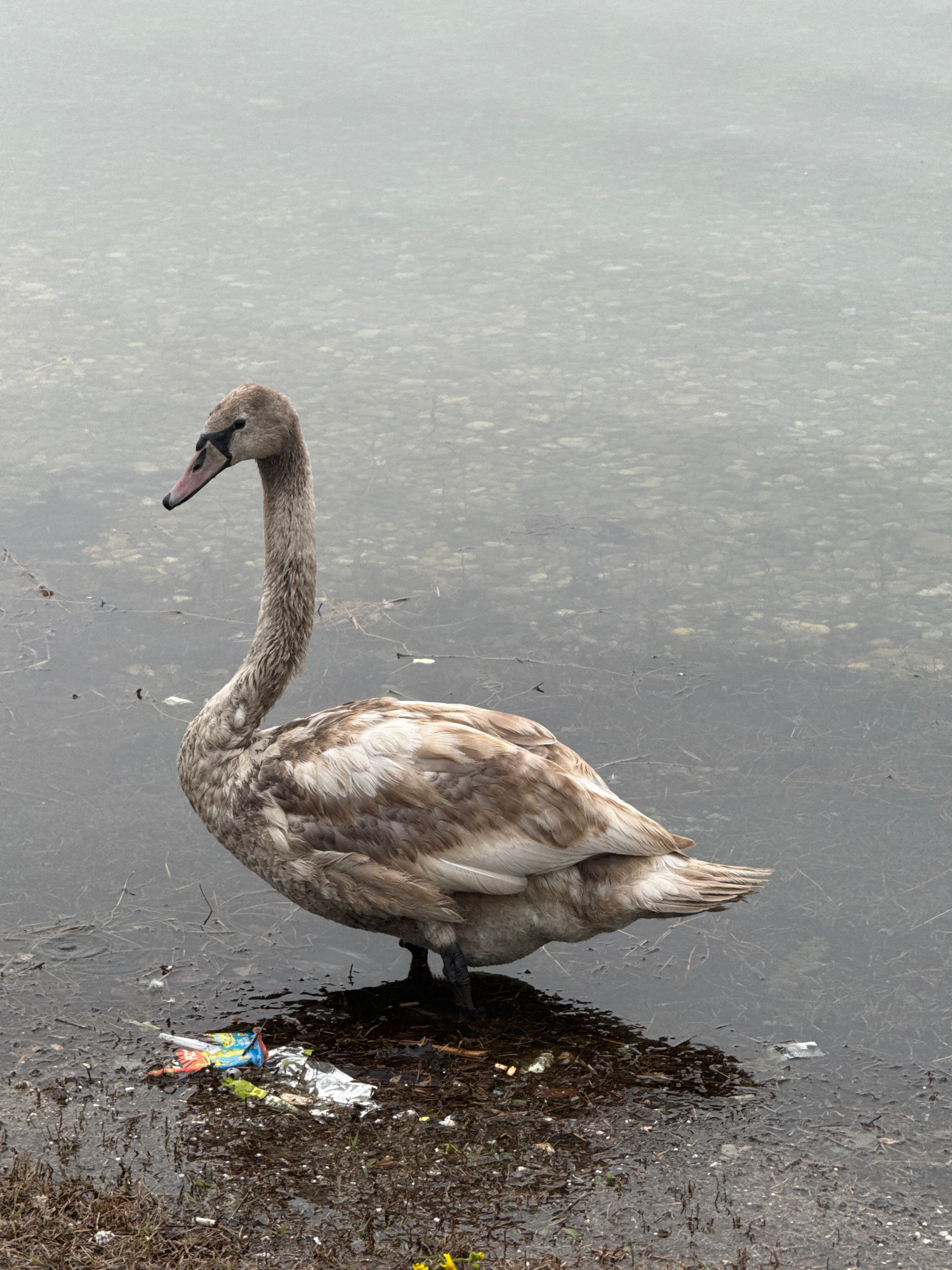 A solitary grey juvenile swan stands at the edge of a body of water, possibly a lake or pond, in Unknown, Unknown. The water's surface is subtly textured, suggesting slight movement or ripples. The sw…read more