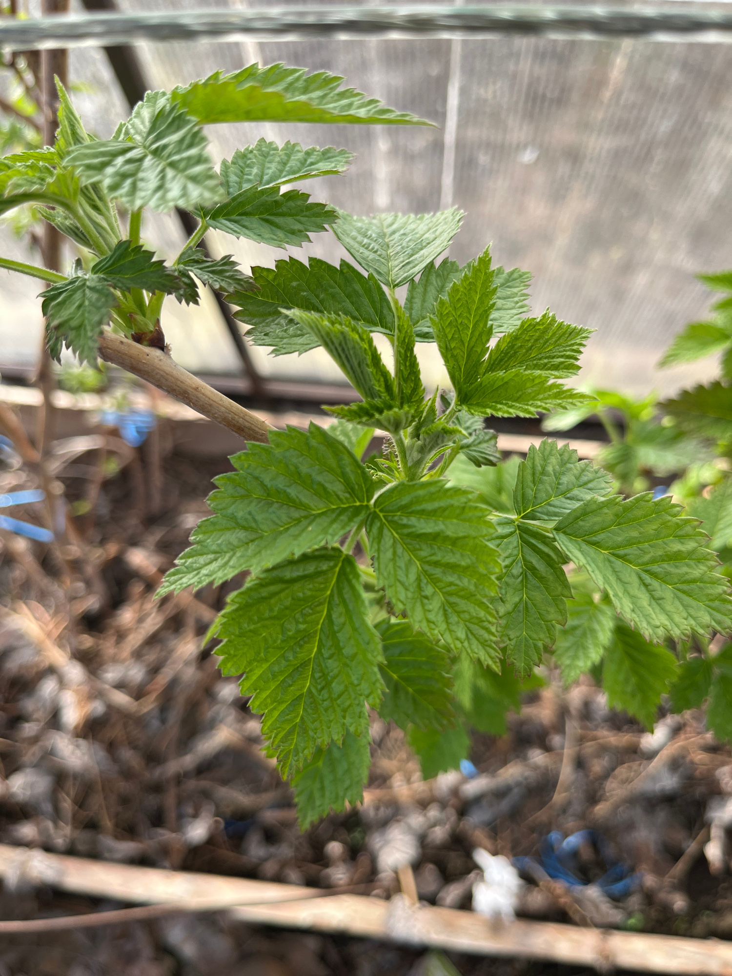 This close-up, vertically oriented photograph features a section of a vibrant green plant, likely a cane fruit such as raspberry, with fresh, healthy leaves. A light brown, woody stem traverses the ce…read more