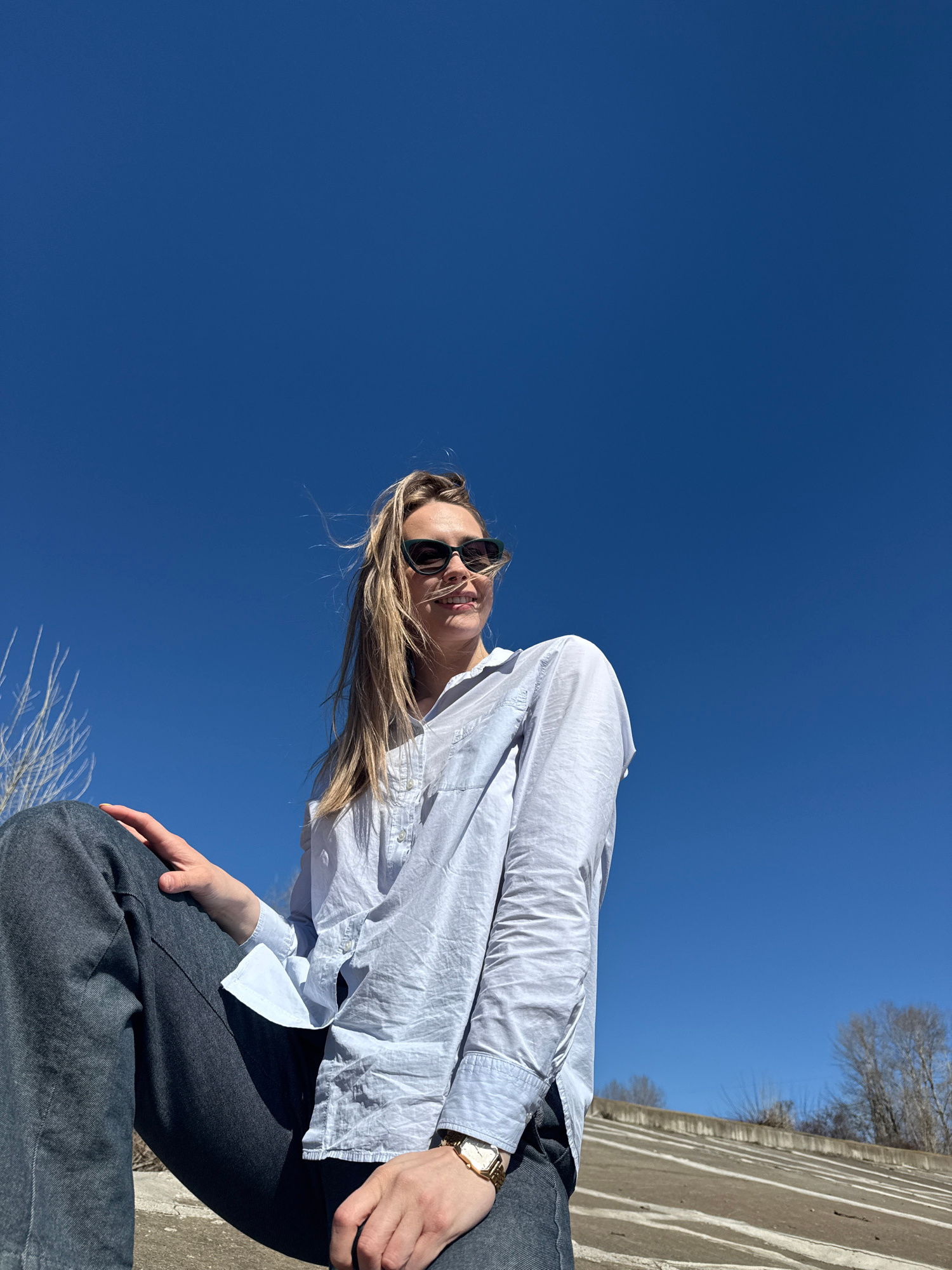 A woman is positioned on what appears to be a concrete structure. She wears sunglasses, a light-colored button-down shirt, and dark pants. Her blonde hair is loose, falling towards the ground. She is…read more