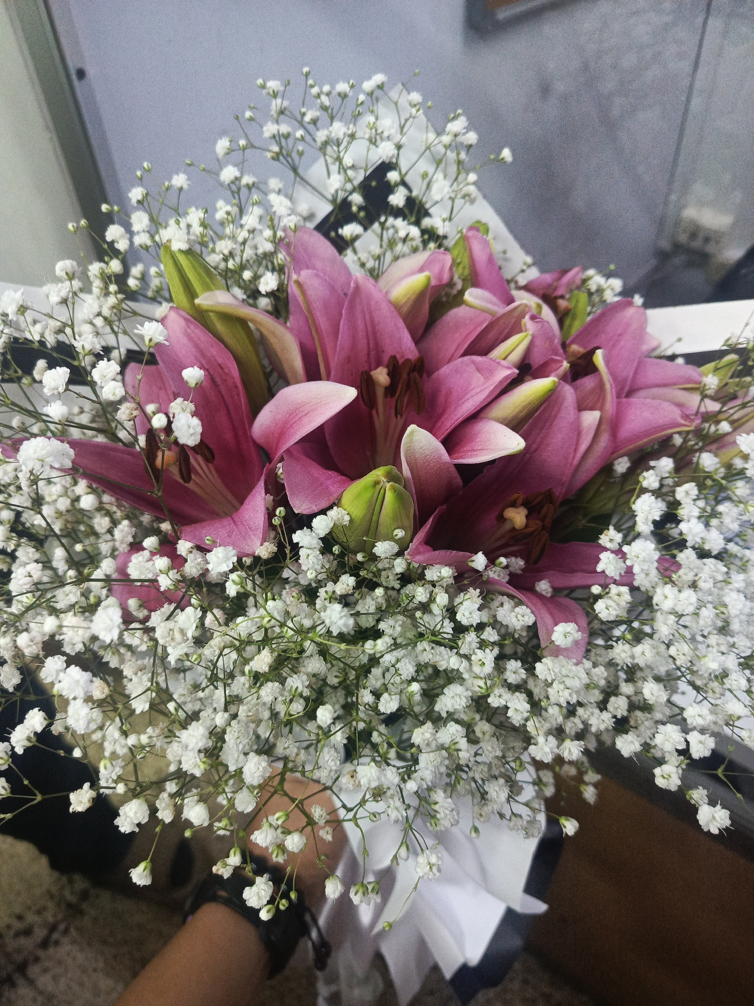 A person is holding a bouquet of flowers. The bouquet consists of pink lilies surrounded by baby's breath. The flowers are wrapped in white paper with a black ribbon. The location is likely in Guayaqu…read more