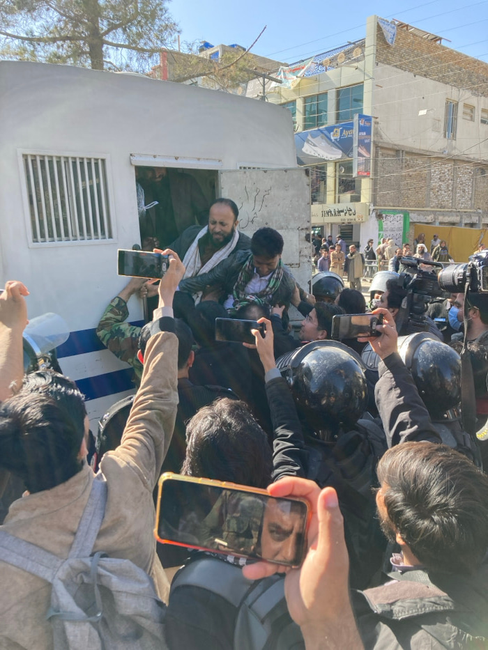 This image depicts a dynamic daytime scene occurring on a city street in Quetta City Tehsil, Pakistan. The focal point is a crowd surrounding a stationary white vehicle, which appears to be a transpor…read more