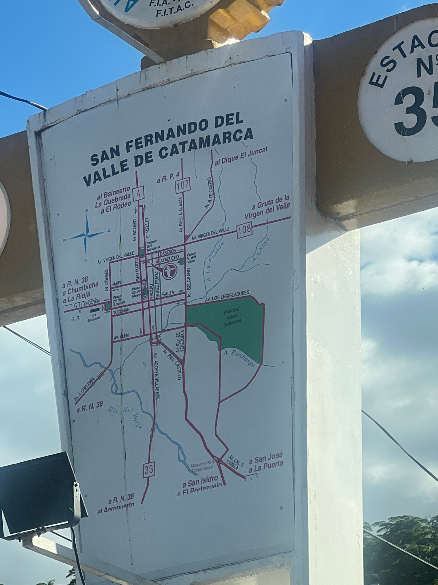 The image shows a sign with a map of San Fernando del Valle de Catamarca, Argentina. The sign is located at an intersection, with roads branching off in multiple directions. The map highlights routes…read more