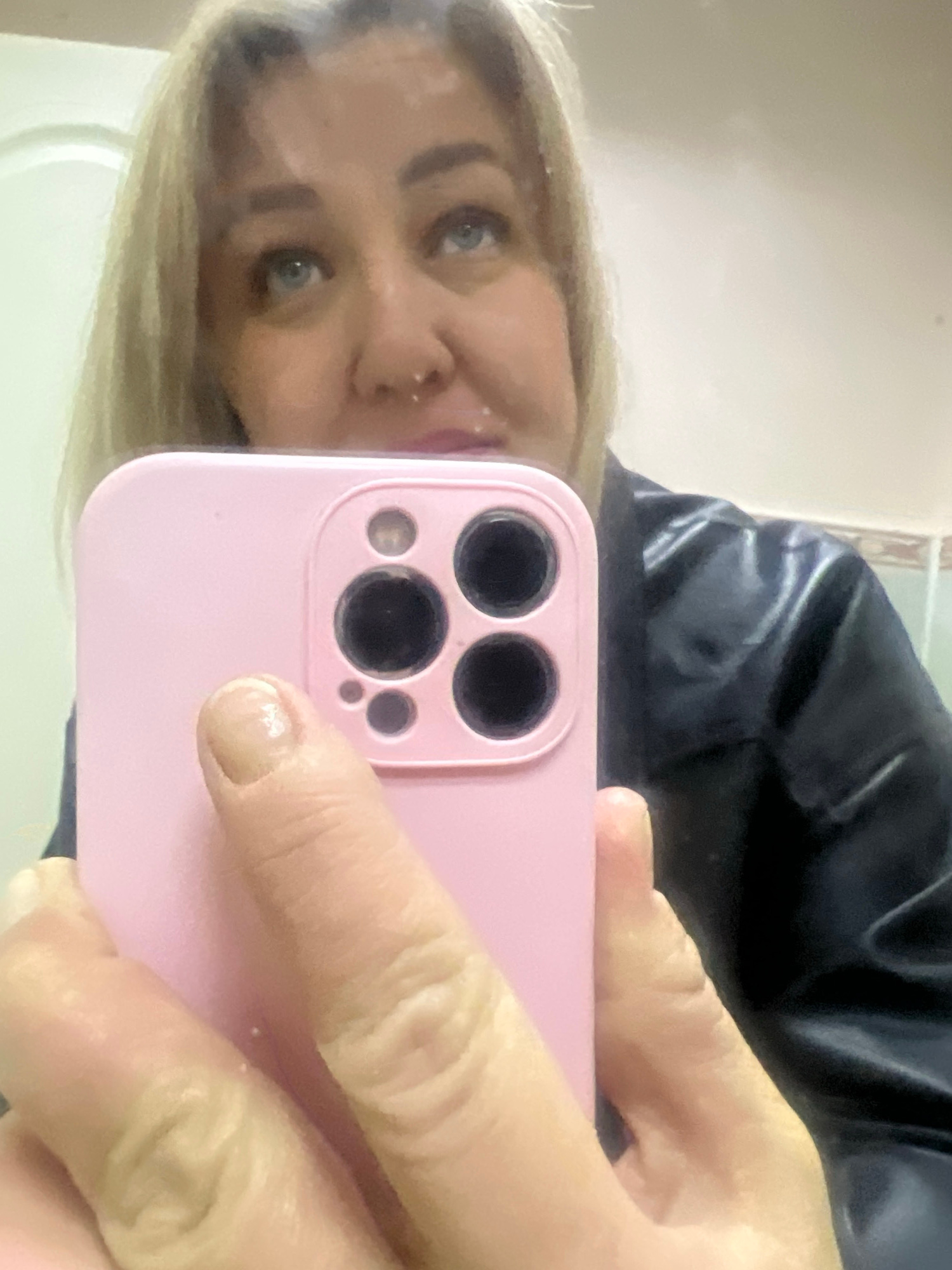 A woman with light blonde hair and blue eyes is taking a selfie with a pink smartphone. She is holding the phone with her fingers visible. A black leather jacket is partially visible in the background…read more