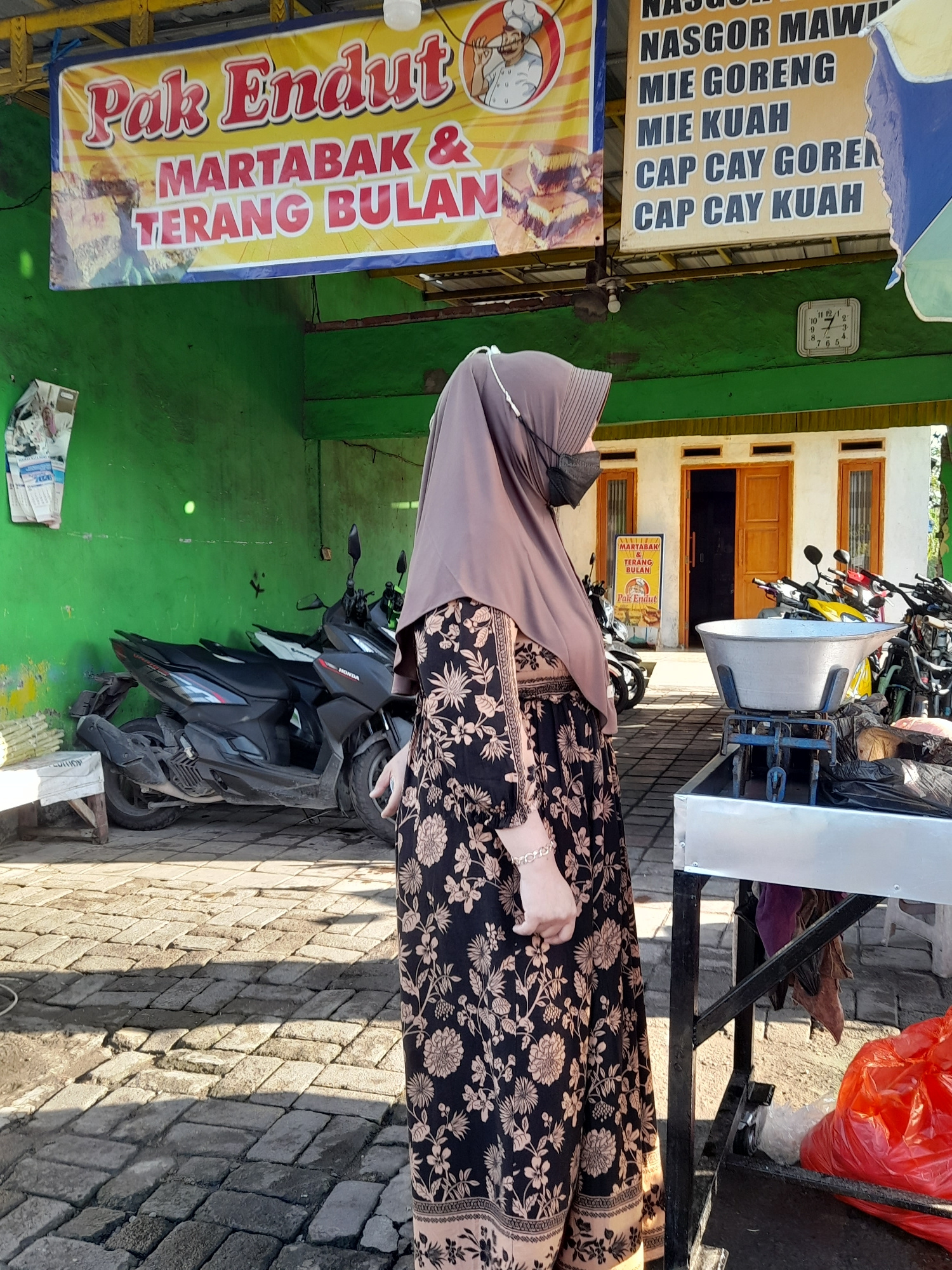 The image depicts an outdoor scene in what appears to be Balonggabus, Indonesia, judging by the writing on the signs. A woman wearing a hijab and a floral-patterned dress is standing on a paved area.…read more