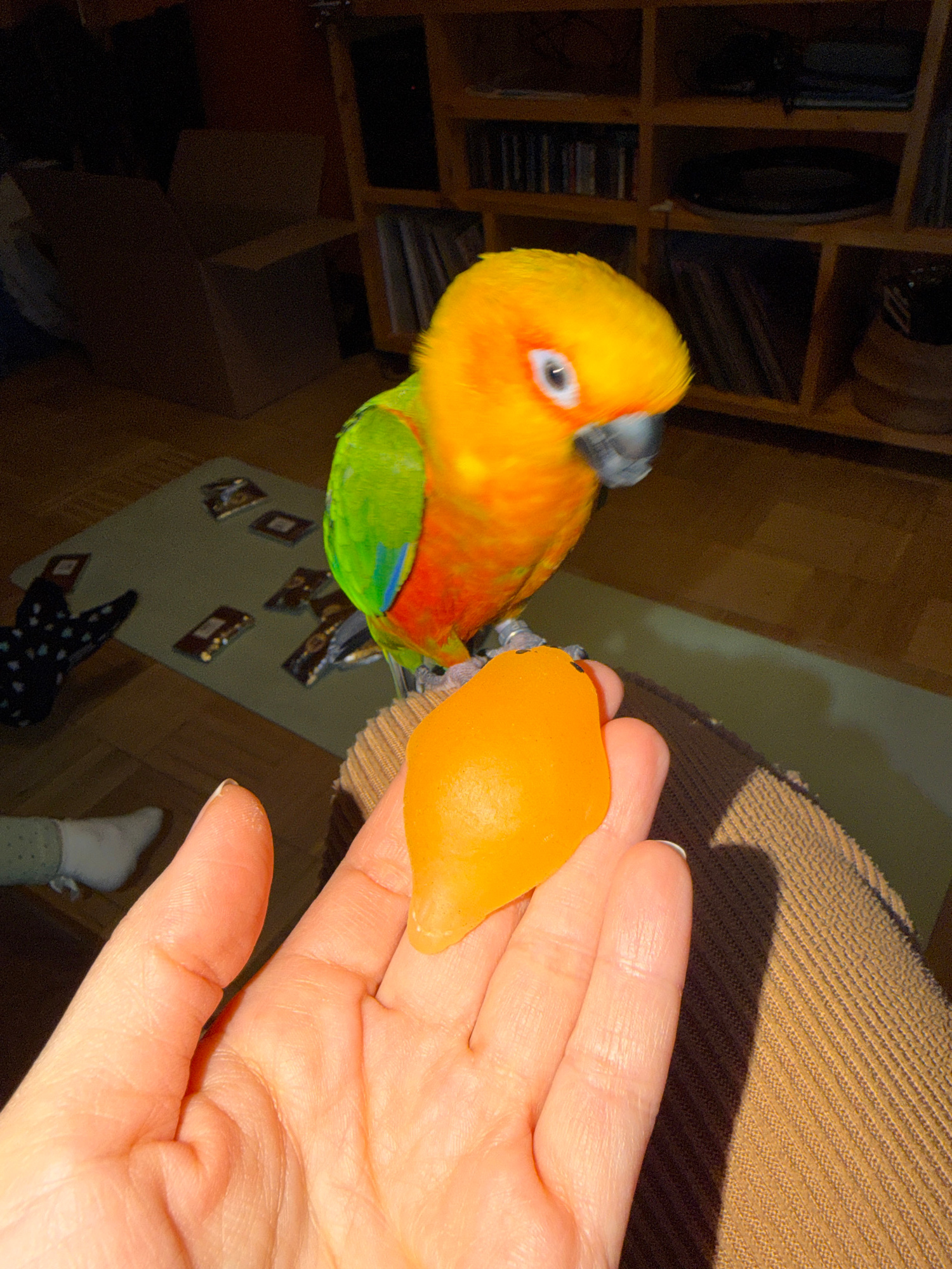 A bright yellow and green conure parrot perches on a person's hand, next to an oval-shaped, orange object. The hand is pale with short fingernails. In the background, a wooden shelf is partially visib…read more