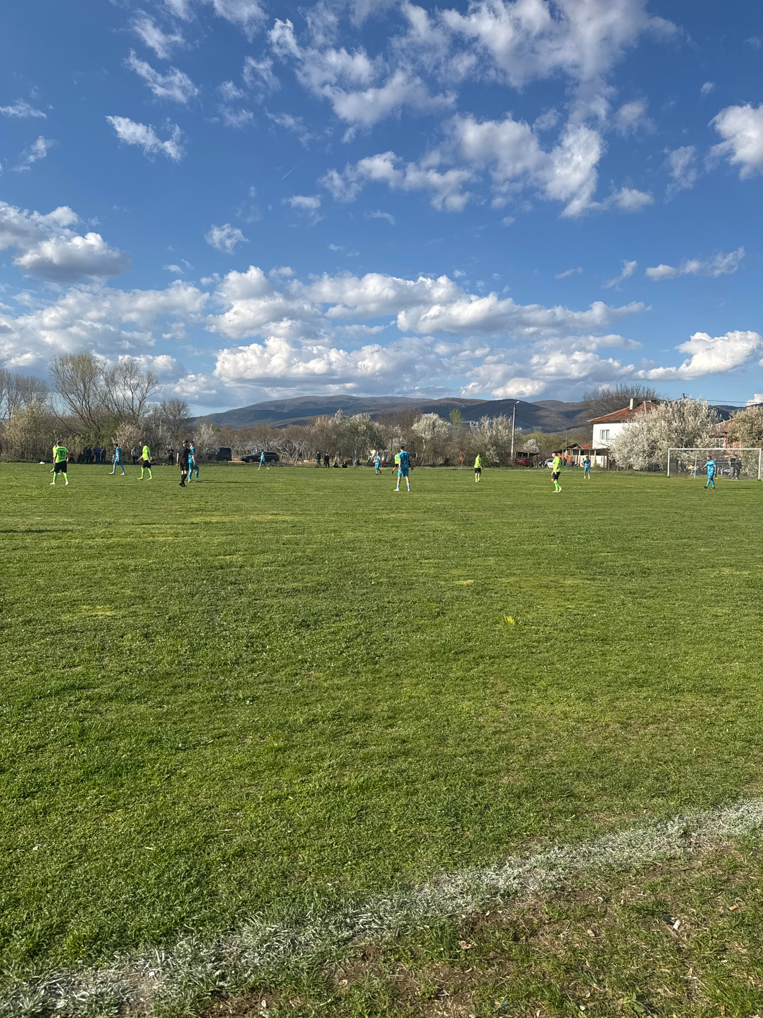 The image depicts a soccer field in Zhabokrat, Bulgaria, with several players in yellow and blue uniforms practicing. The field is green with a white sideline visible on the right. A soccer goal is po…read more