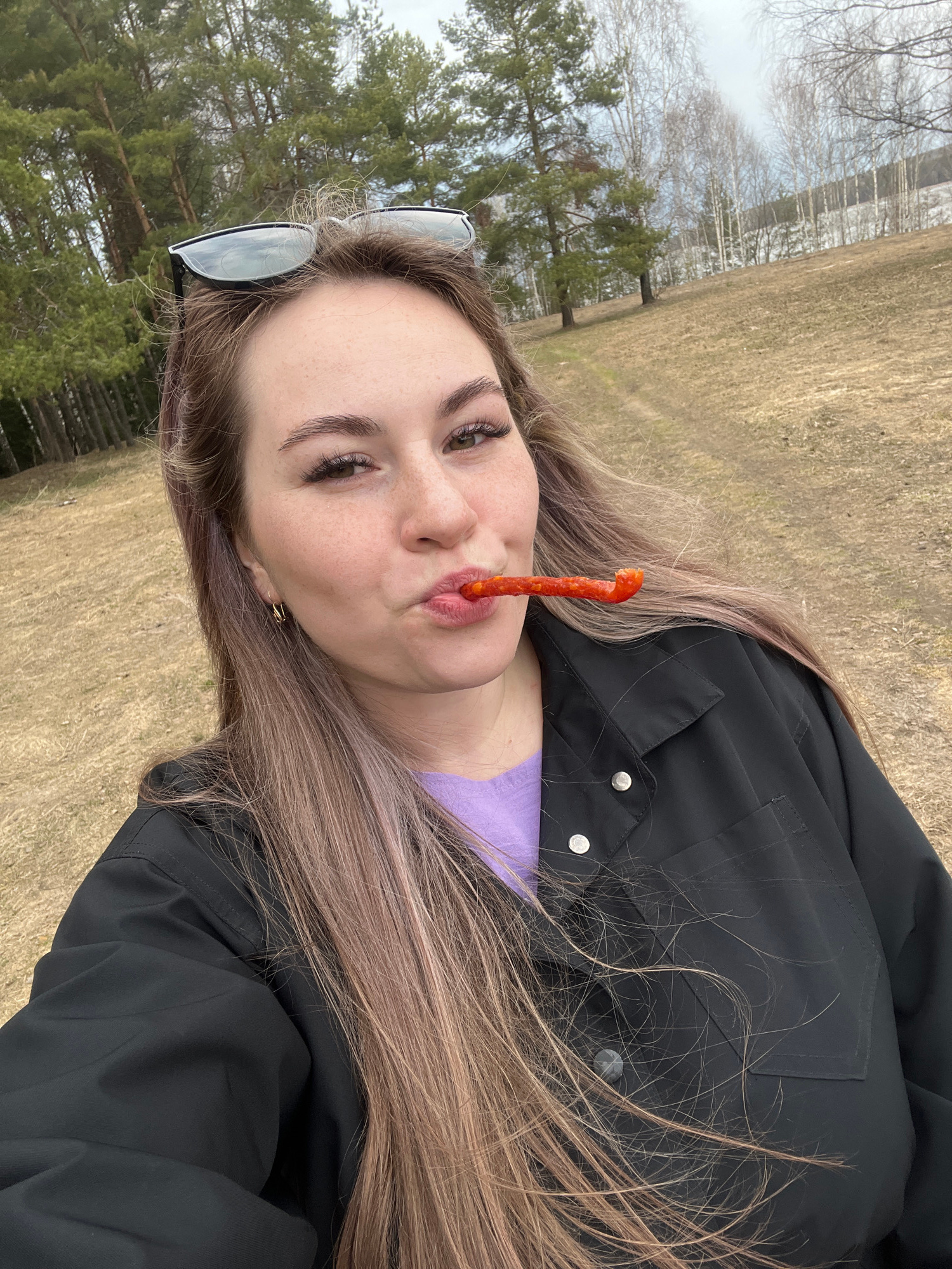 A woman is holding a long, thin, red object in her mouth, possibly a meat stick or similar food item. She is wearing a black jacket over a purple shirt and sunglasses are resting in her hair. She is o…read more
