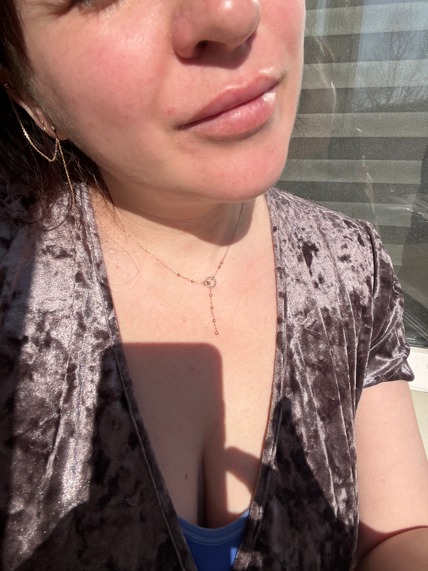 A woman is seen from a low-angle perspective, lying down. Her face is partially visible, focusing on her lips and nose. She is wearing a brown, crushed velvet-like top. A delicate gold necklace adorns…read more