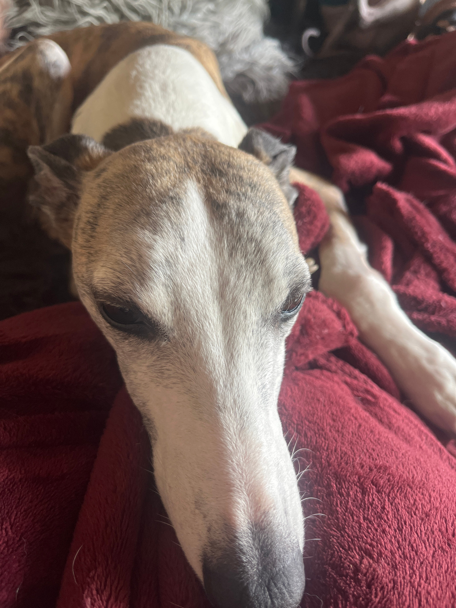 A close-up, high-angle shot features a brindle-patterned Whippet dog resting on a deep red, textured blanket. The dog's head, oriented horizontally, occupies the right side of the frame, with its long…read more