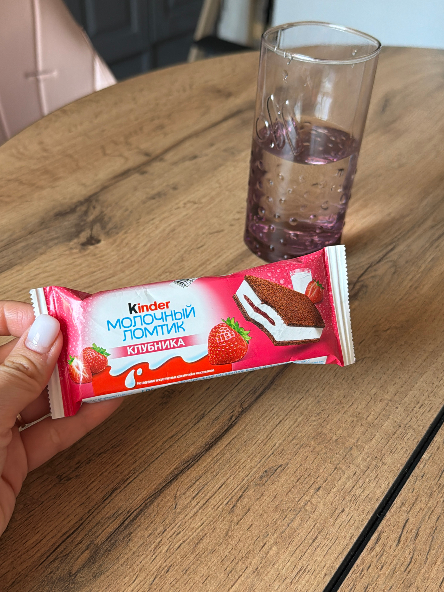 The image shows a partially filled glass and a Kinder Milk Slice bar, strawberry flavor, on a wooden surface. The bar is held by a person's hand with white nail polish. The text on the packaging is in…read more