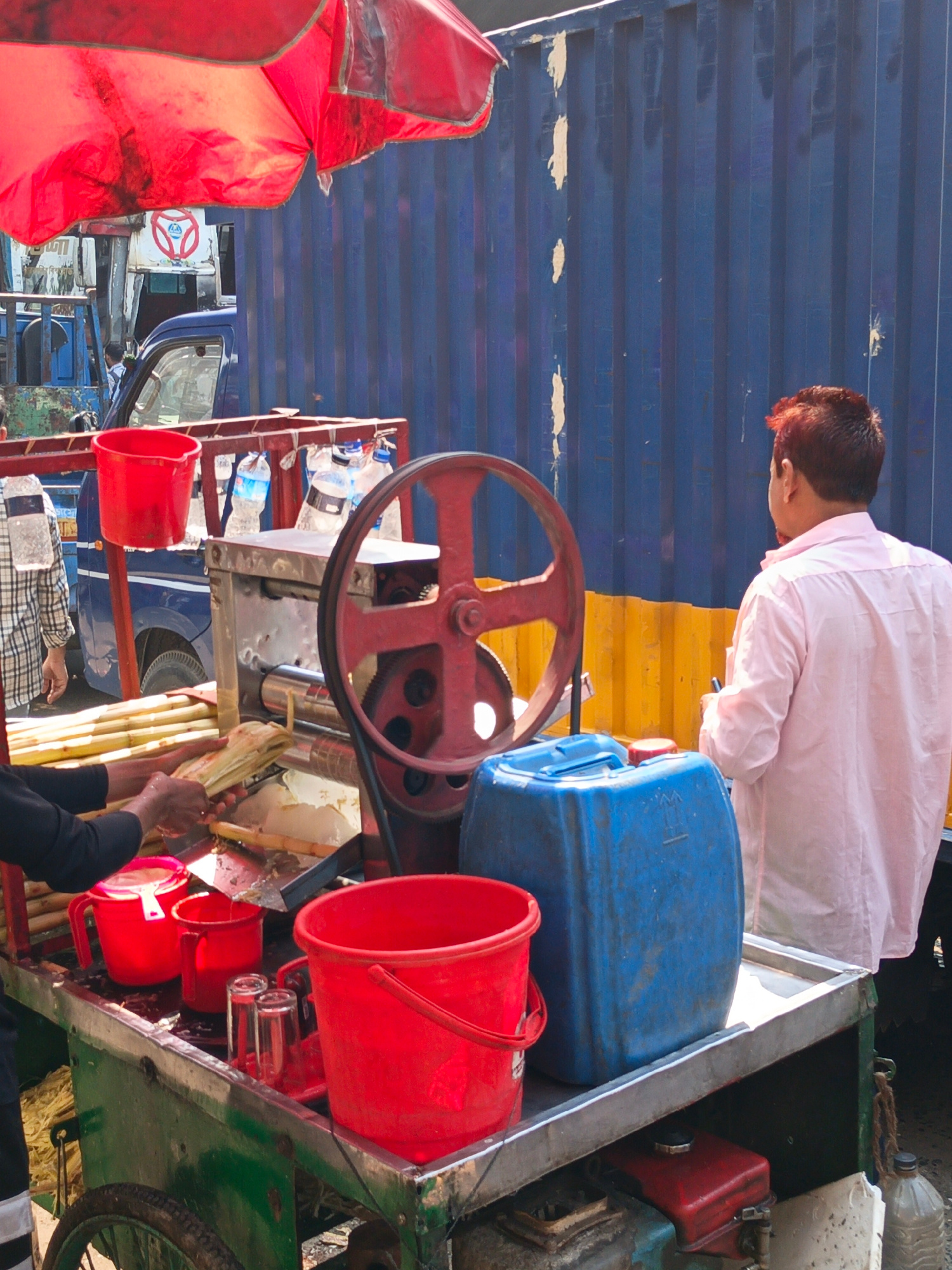 A street vendor operates a sugarcane juice cart in Dhaka, Bangladesh. The cart, under a red umbrella, has a sugarcane press with a large red wheel. A man in a light pink shirt stands on the right, fac…read more