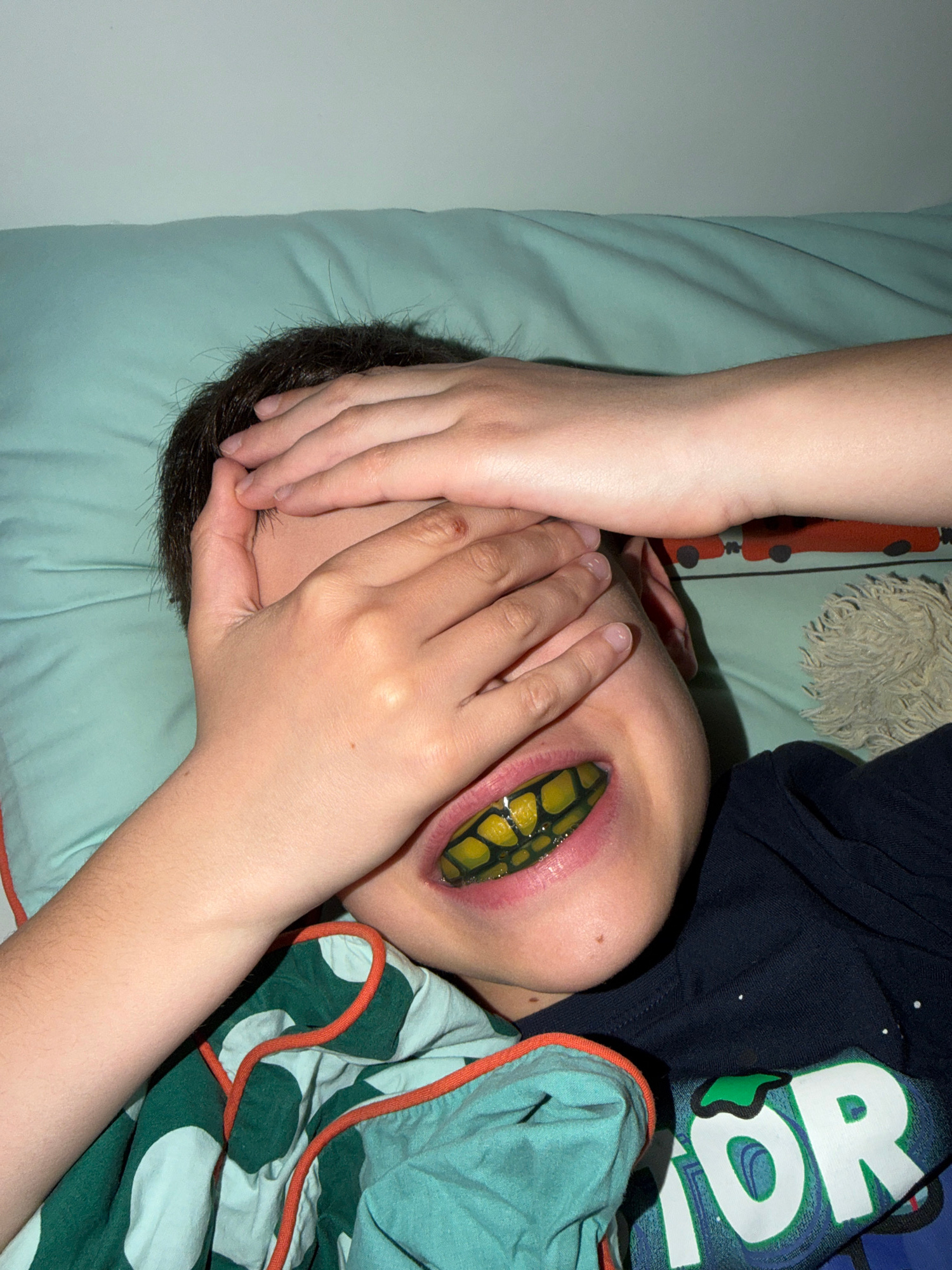 The image shows a person lying down with their face partially obscured by their hands. A yellow and black snake-like object is placed in the person's mouth, causing their lips to be stretched. The per…read more
