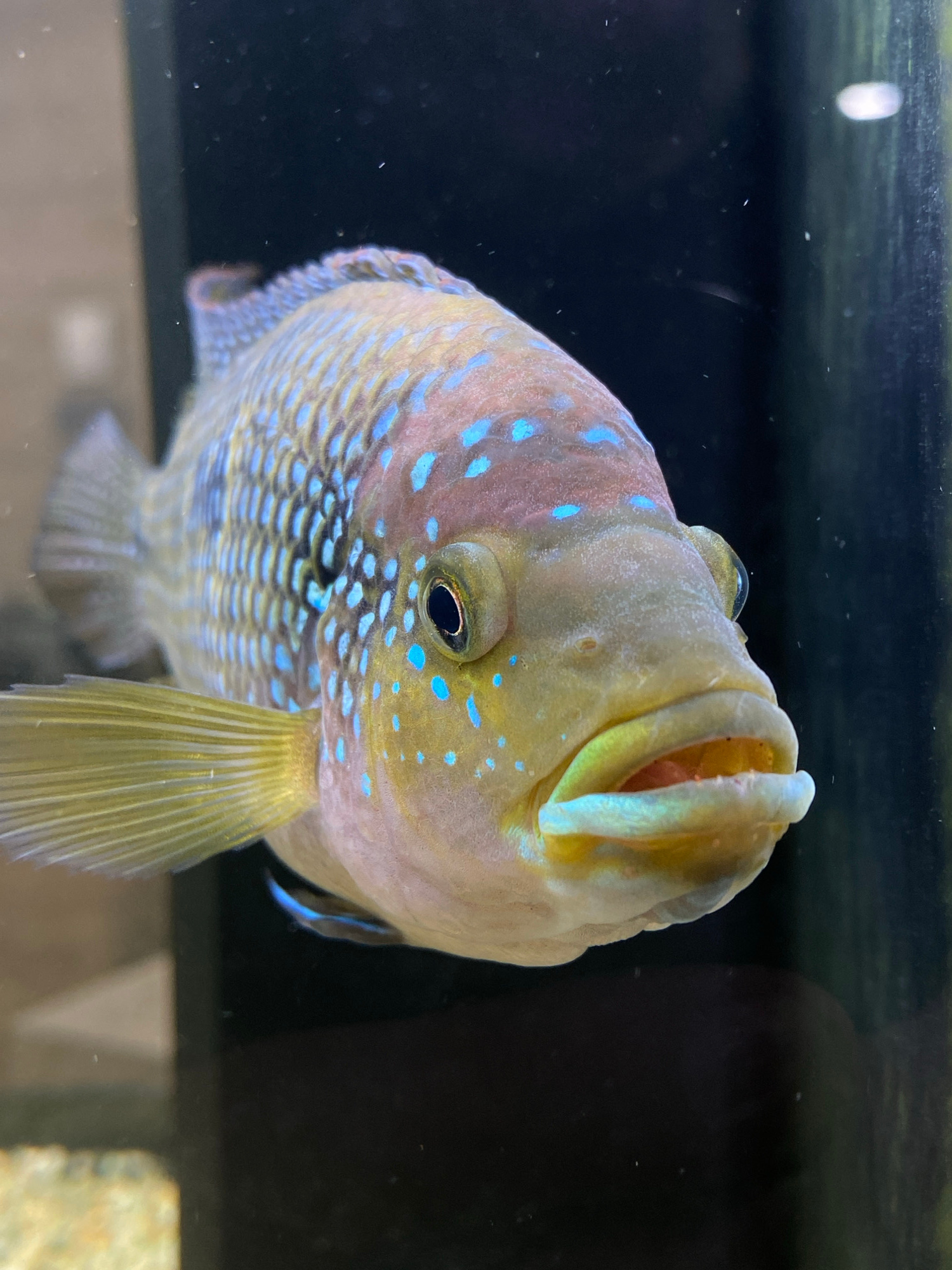 A close-up, eye-level shot depicts a fish, likely a cichlid, with an open mouth and extended lips. The fish exhibits a light tan coloration, speckled with blue spots. The eye is visible on the left si…read more