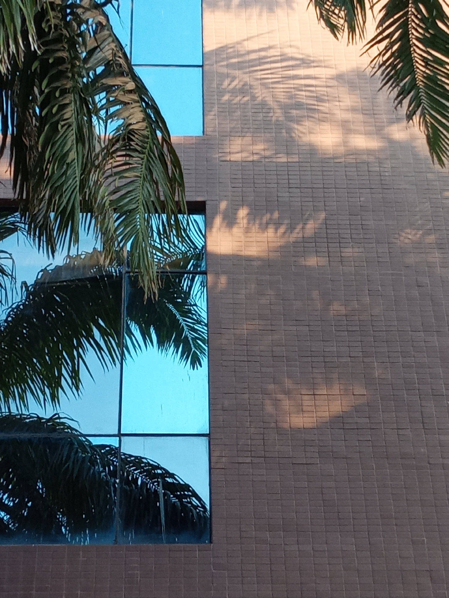 An eye-level, vertical shot shows a building in the city of Bắc Nha Trang, Vietnam. The left side of the shot displays two blue-tinted glass windows reflecting palm fronds. Actual palm fronds partiall…read more