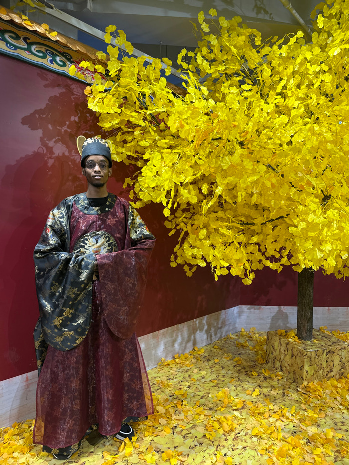 An adult male stands centered within an indoor, themed cultural display in Yuzhong District, China. He faces forward, exhibiting a neutral expression, and wears round eyeglasses. His attire consists o…read more