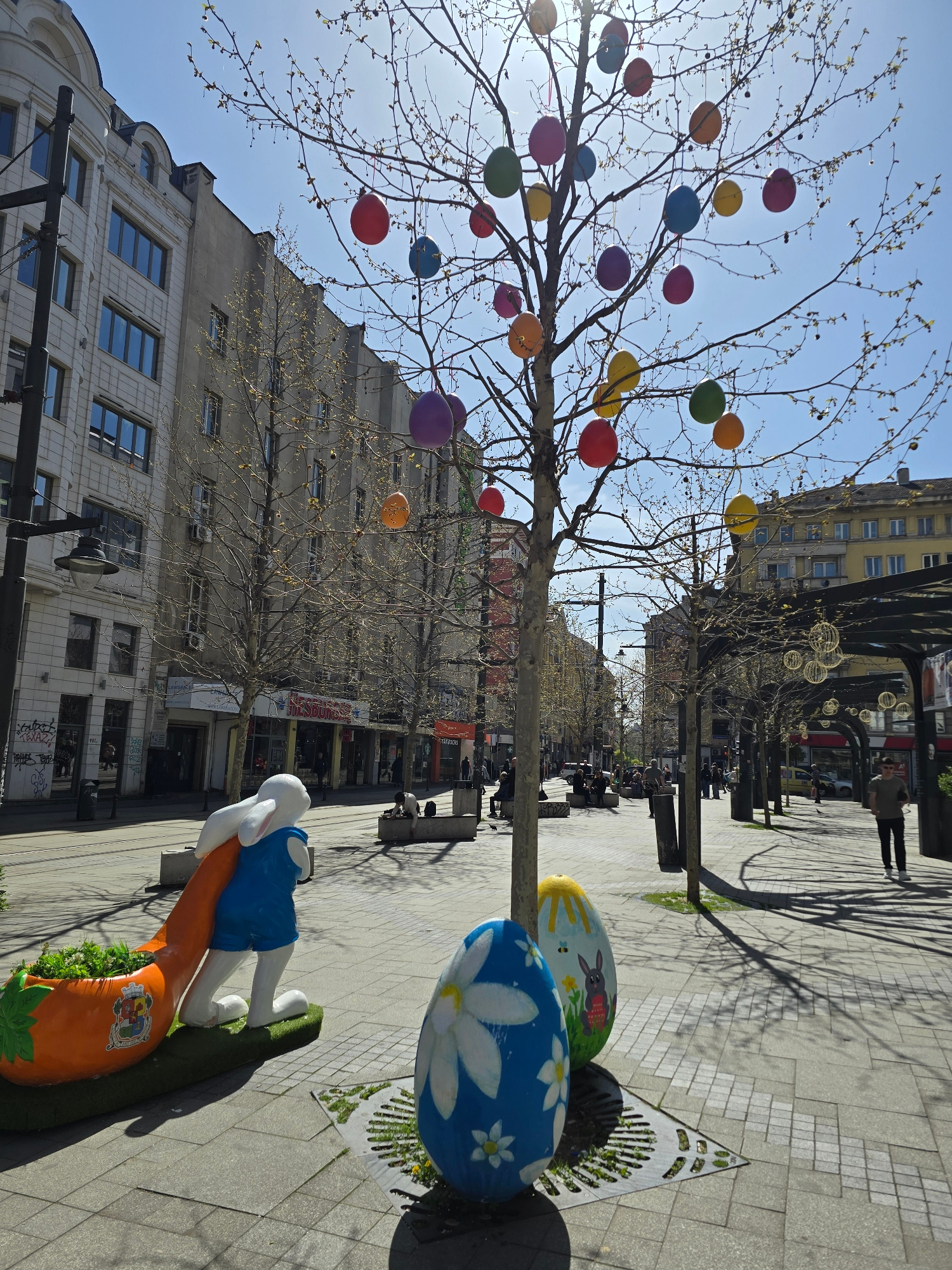 The image displays a lively Easter-themed street scene on a bright, sunny day in Sofia, Bulgaria, likely during early spring. The central feature is a tree with bare branches, heavily decorated with n…read more