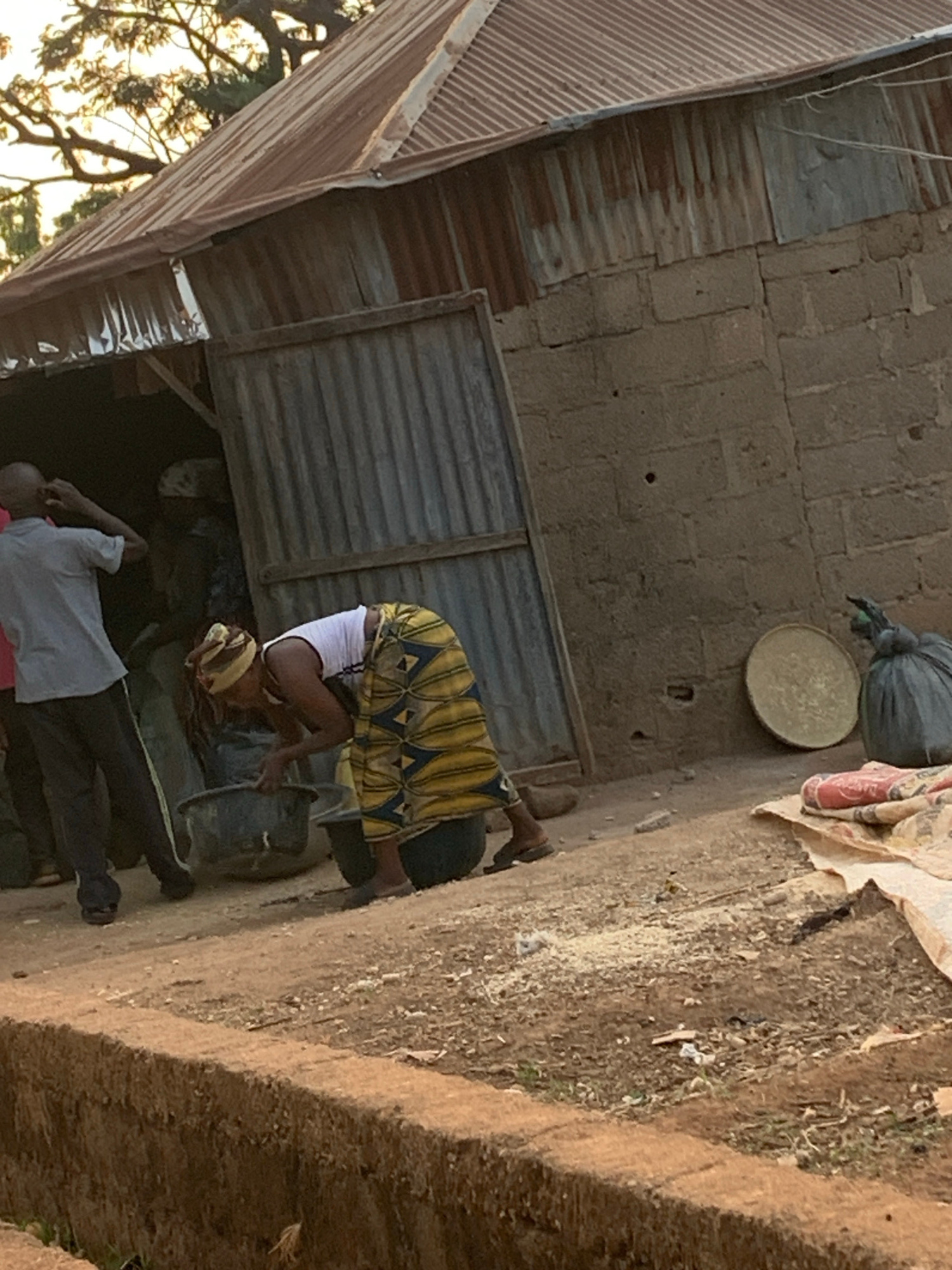 In Agban, Nigeria, a woman in a yellow and blue patterned top and white shorts is bent over a bucket outdoors. A man in a light-colored shirt and dark pants is lying on the ground nearby. A building w…read more