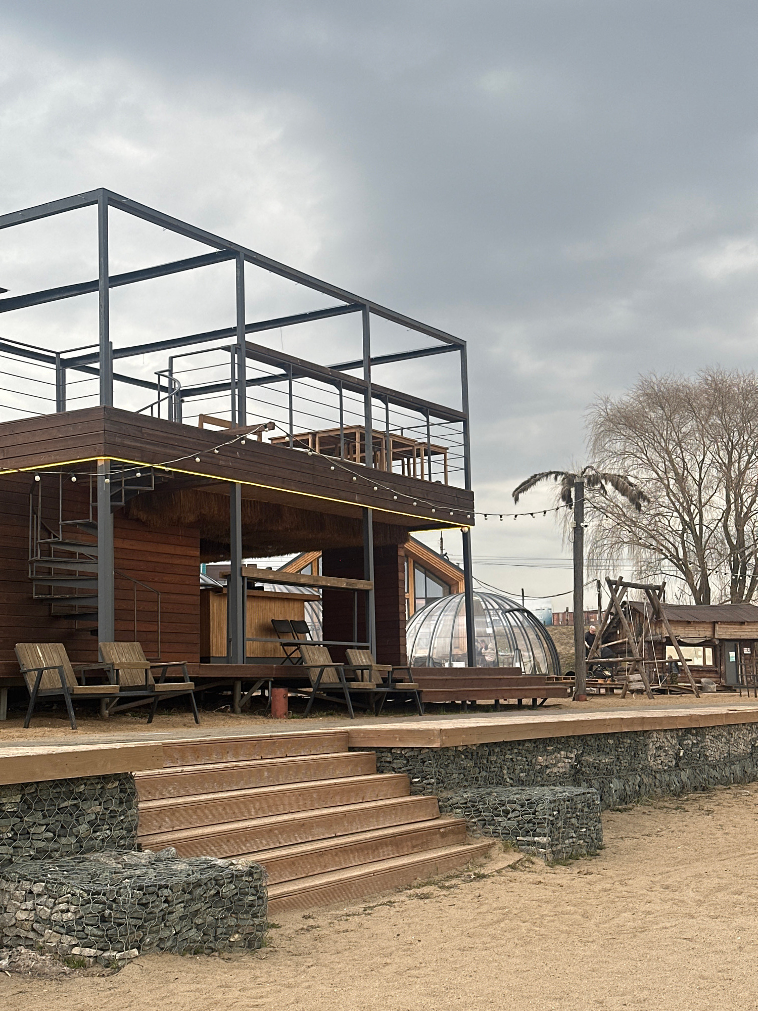 The image depicts a multi-level wooden structure with metal framework, possibly a restaurant or recreational facility, located outdoors near a sandy area or beach. The sky is overcast. There are woode…read more